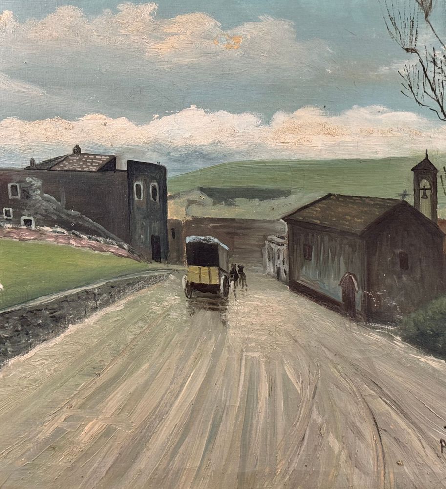 Dipinto olio su tela, periodo XX secolo scuola Italiana, raffigurante Stradina di campagna. Dimensioni compreso cornice: 60x51 cm. Dimensioni interno cornice: 50x40 cm. Reca firma in basso a destra da artista non identificato. Opera in buone condizioni.