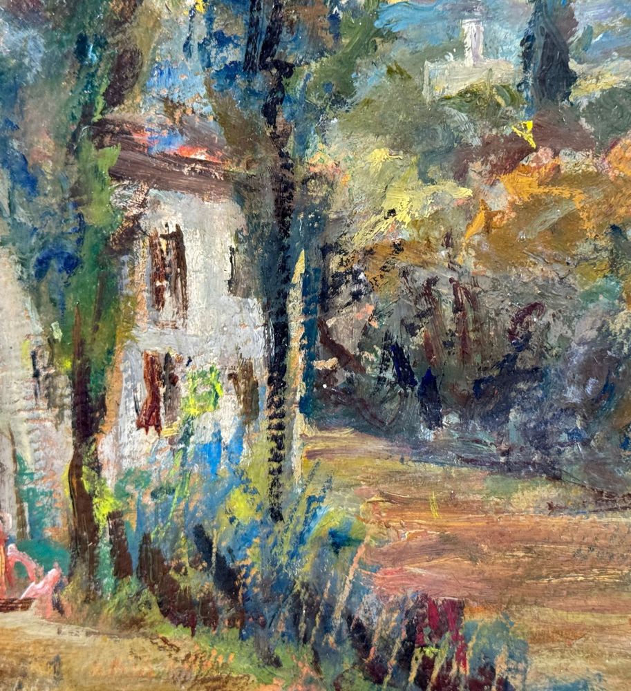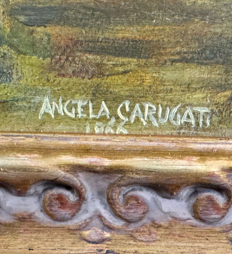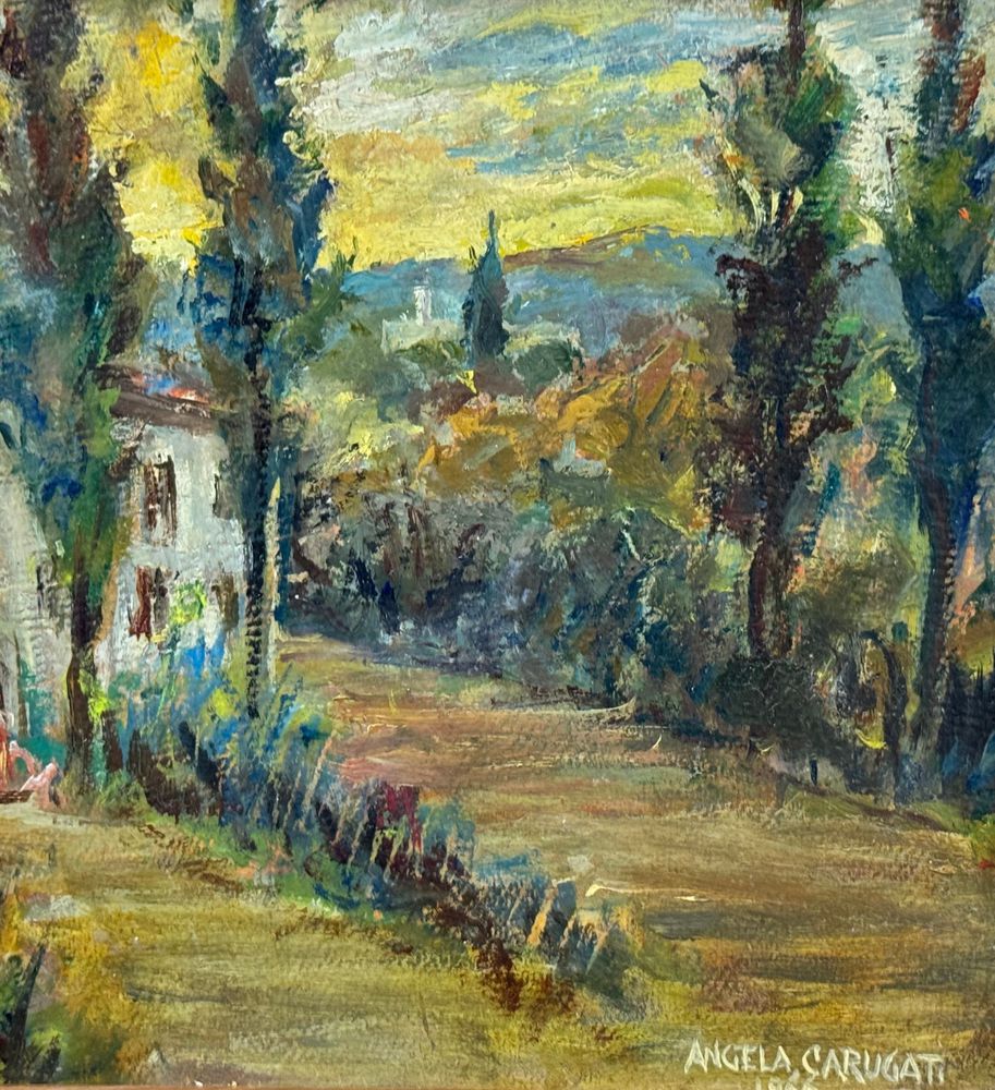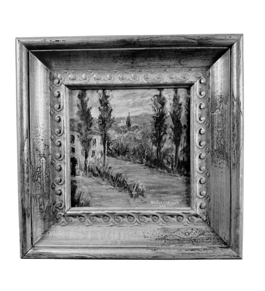Dipinto olio su cartoncino, periodo XX secolo scuola italiana, raffigurante Paesaggio alberato. Dimensioni compreso cornice: 39,5x39 cm. Dimensioni interno cornice: 24x24 cm. Reca firma in basso a destra da Angela Carugati (1881 - 1977). Opera in buone condizioni.