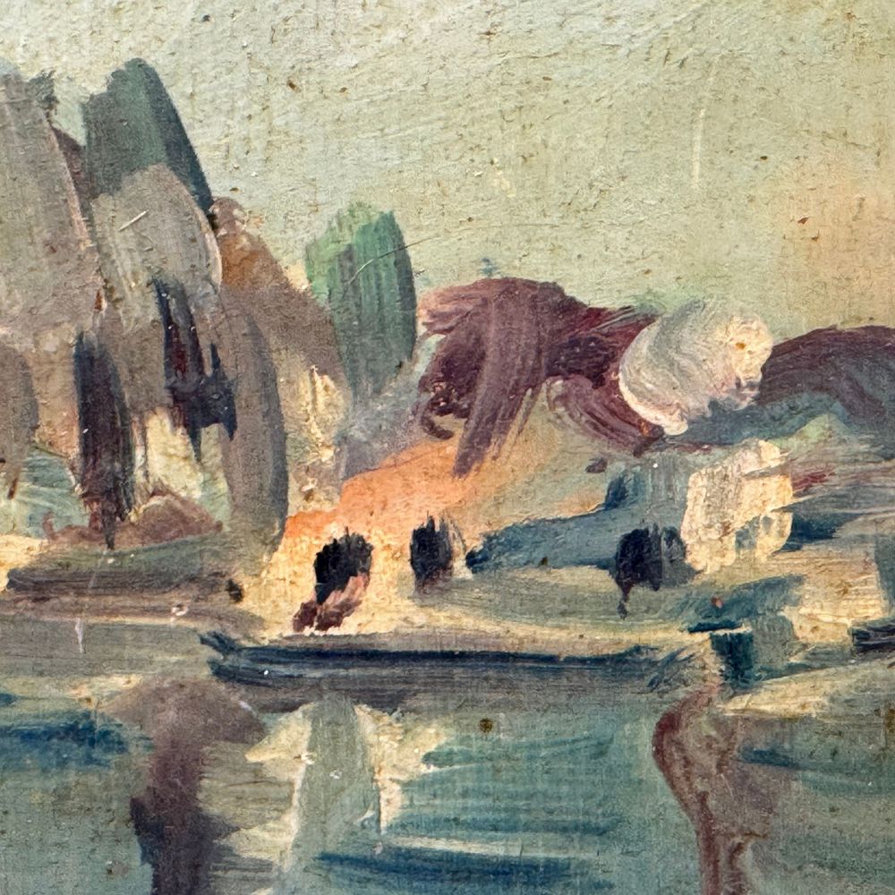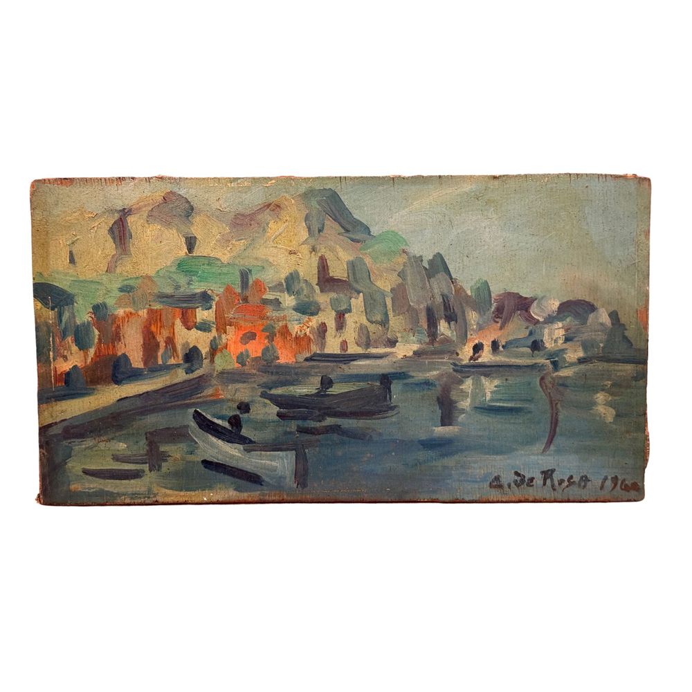 Dipinto olio su tavola, periodo XX secolo scuola Napoletana, raffigurante Marina a Pozzuoli. Dimensioni: 14,5x27 cm. Reca firma da A. De Rosa. Opera in buone condizioni.