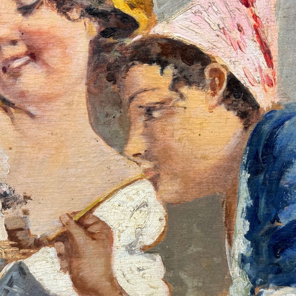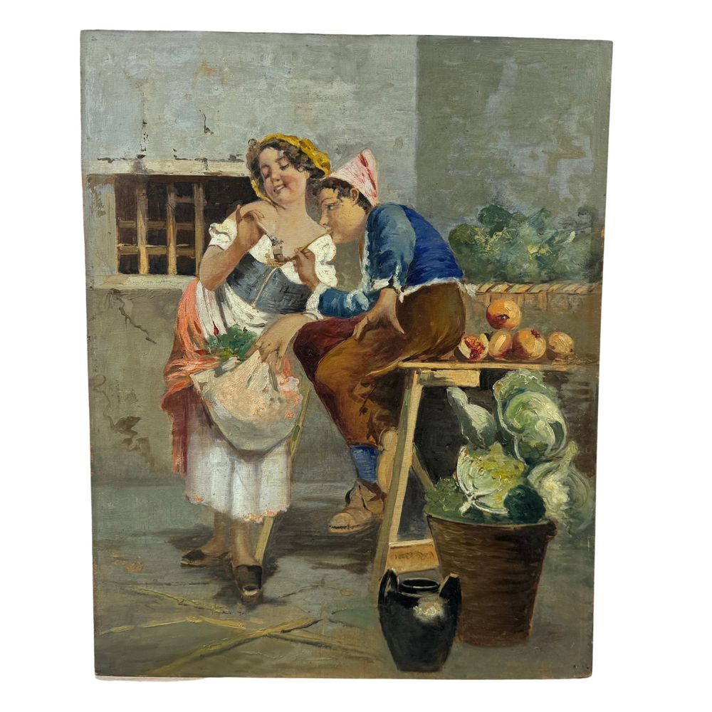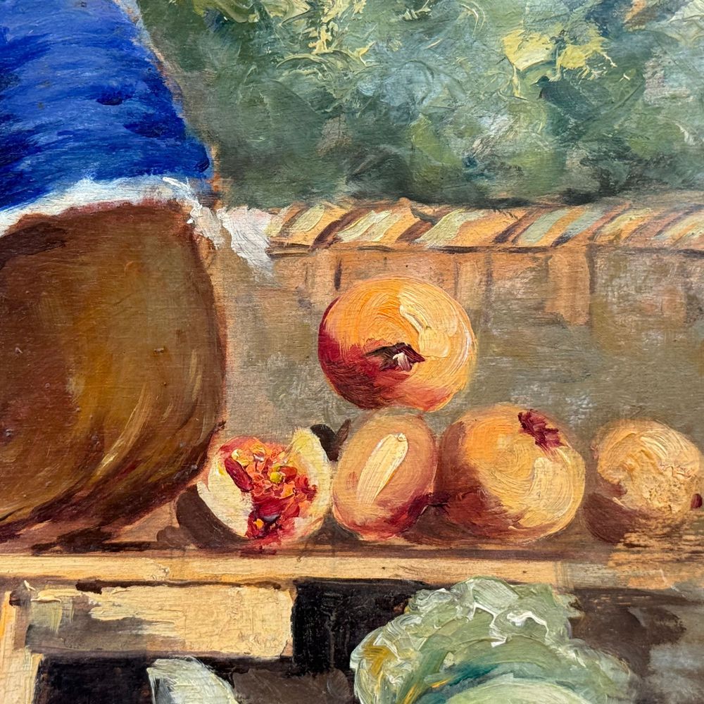 Dipinto olio su tavola, periodo XX secolo scuola Italiana, raffigurante La venditrice di frutta. Opera tratta da un lavoro di Balsamo Salvatore. Dimensioni: 50x62 cm. Da artista anonimo. Opera in ottime condizioni. Databile 1930