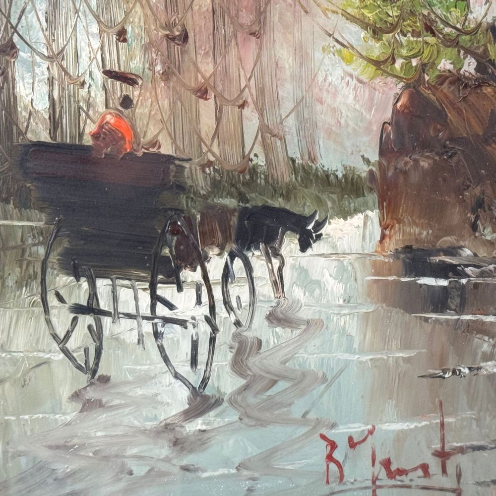 Dipinto olio su pannello, periodo XX secolo scuola Italiana, raffigurante Strada con carrozza. Dimensioni interno cornice: 40x30 cm. Dimensioni compreso cornice: 62x52 cm. Firmato in basso a destra da Rolando Monti (1906 - 1991). Opera in buone condizioni.