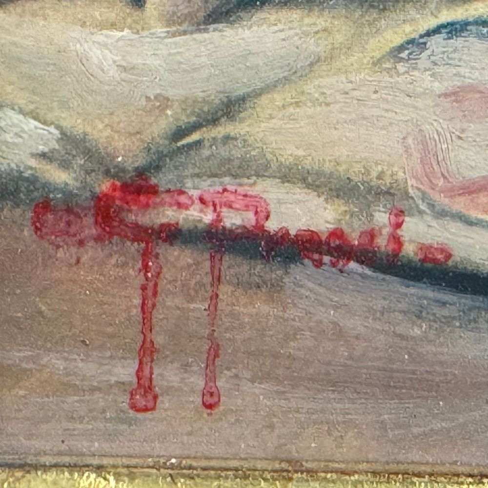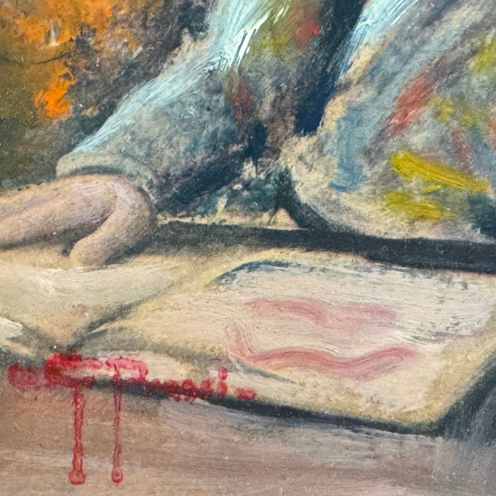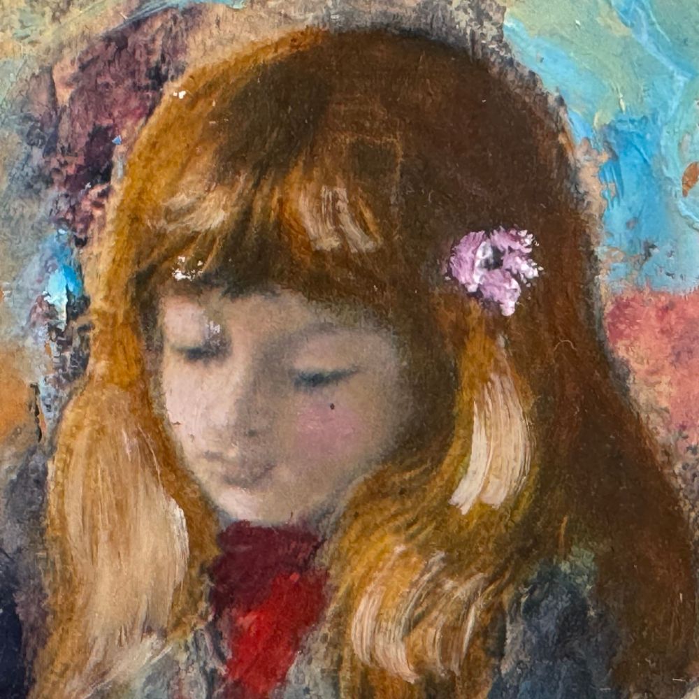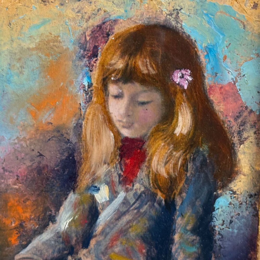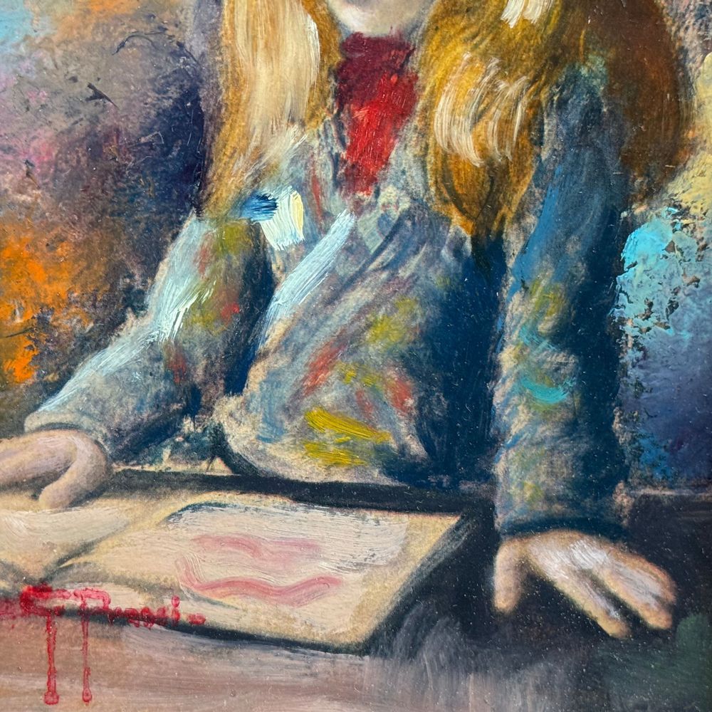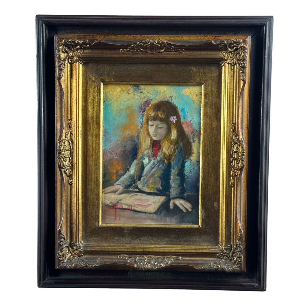 Dipinto olio su cartoncino, periodo XX secolo scuola Italiana, raffigurante Bambina in lettura. Dimensioni interno cornice: 14x20 cm. Dimensioni compreso cornice: 31x37 cm. Reca firma in basso a sinistra da Giovanni Prassi 1945. Opera in buone condizioni.