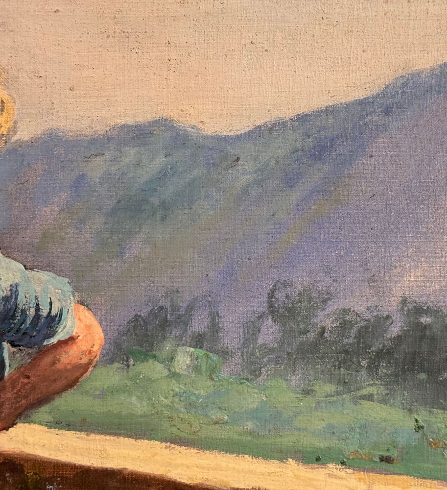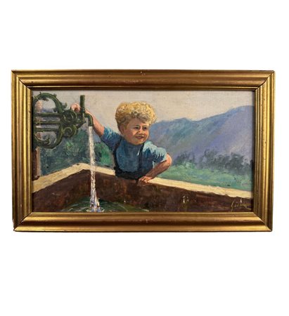 Dipinto olio su pannello, periodo XX secolo scuola Italiana, raffigurante Bambino alla fontana. Dimensioni compreso cornice: 51x32 cm. Dimensioni interno cornice: 45x25 cm. Reca firma in basso a destra da artista non identificato. Opera in buone condizioni.