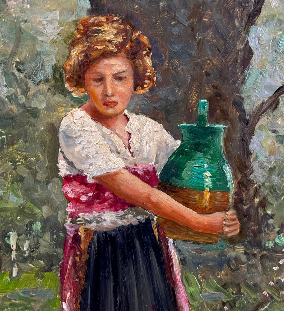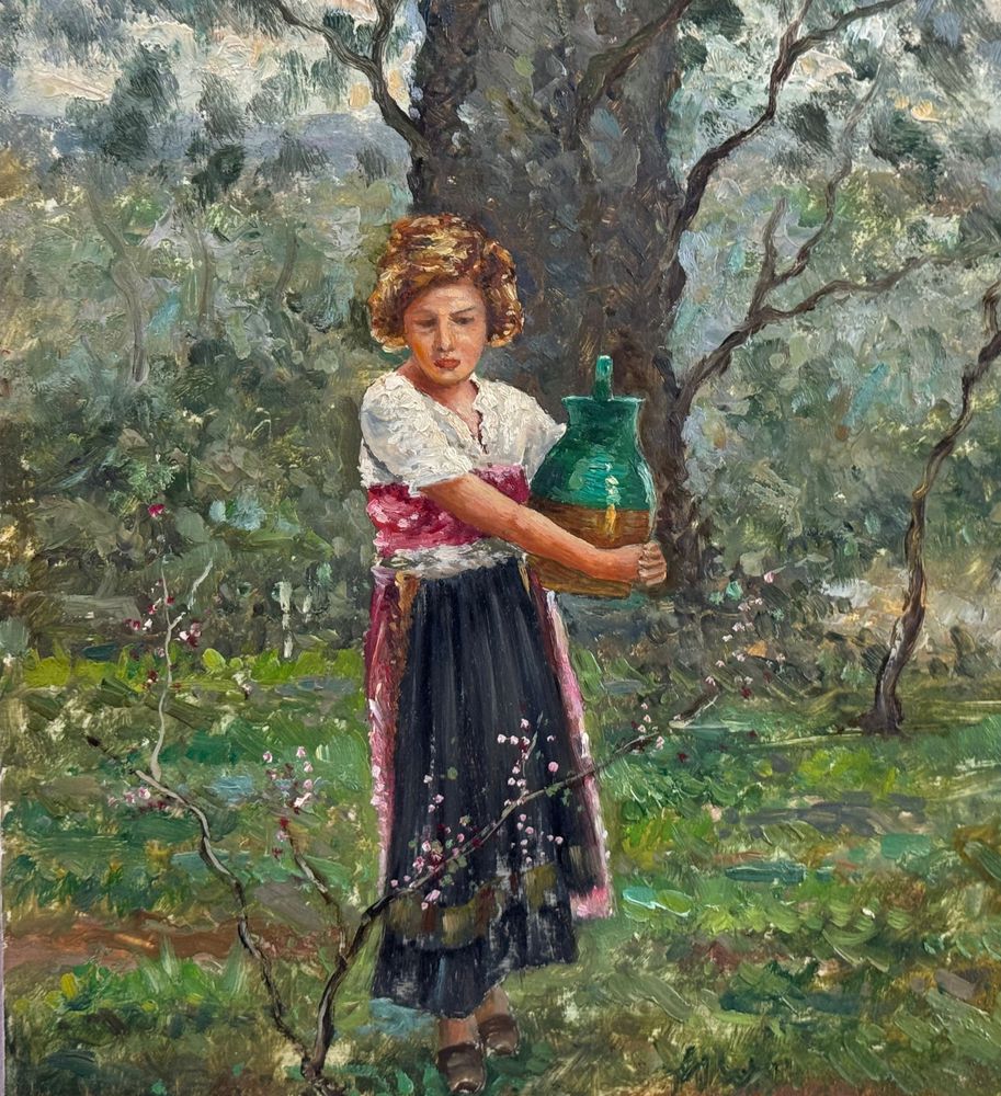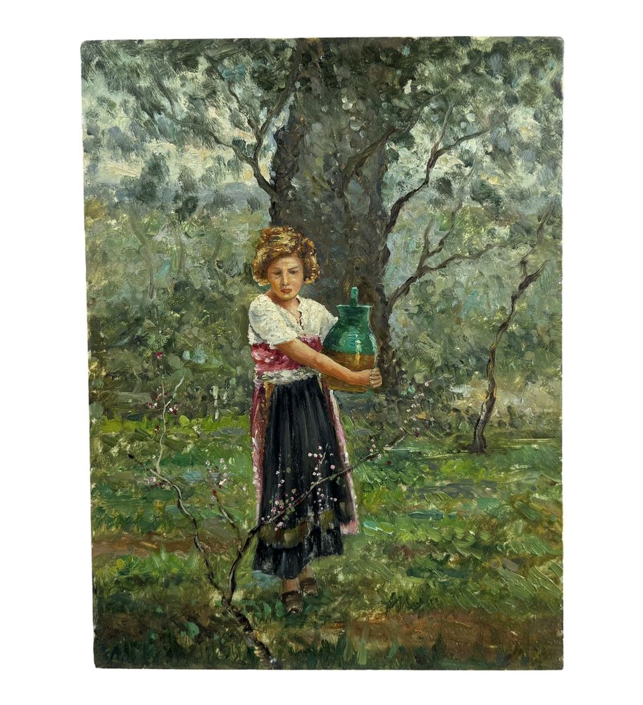 Dipinto olio su tavola, periodo XX secolo scuola Italiana, raffigurante Ritratto di bambina in campagna. Dimensioni 30x40 cm. Da artista anonimo. Opera in buone condizioni.