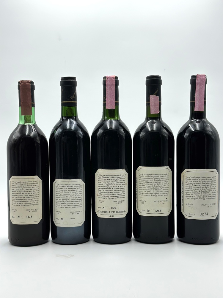 Italia-Toscana 0,75 Toscana, Brunello di Montalcino DOCG - 5 bottiglie (bt), annate 1981, 1983, 1987, 1988 e 1990.