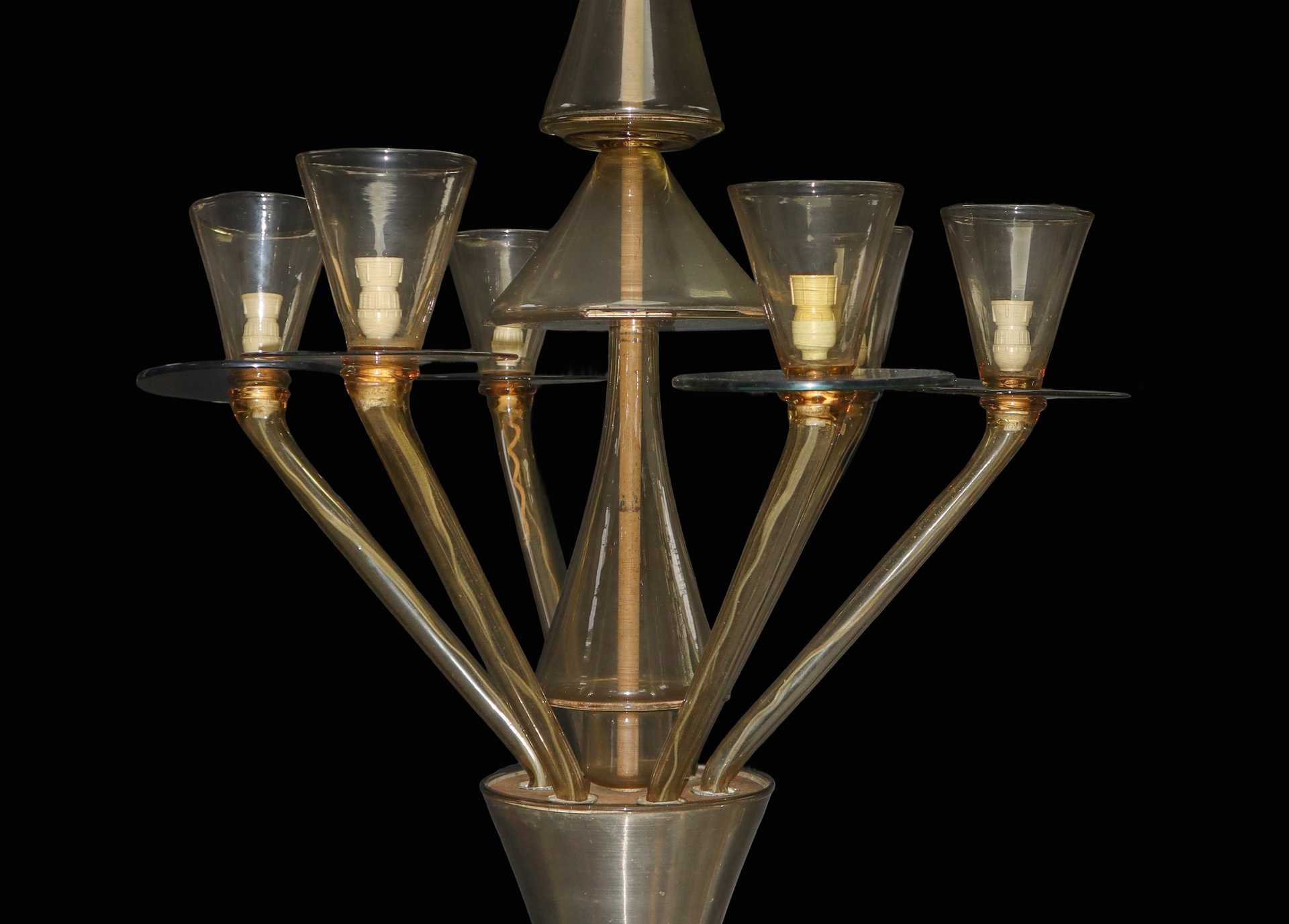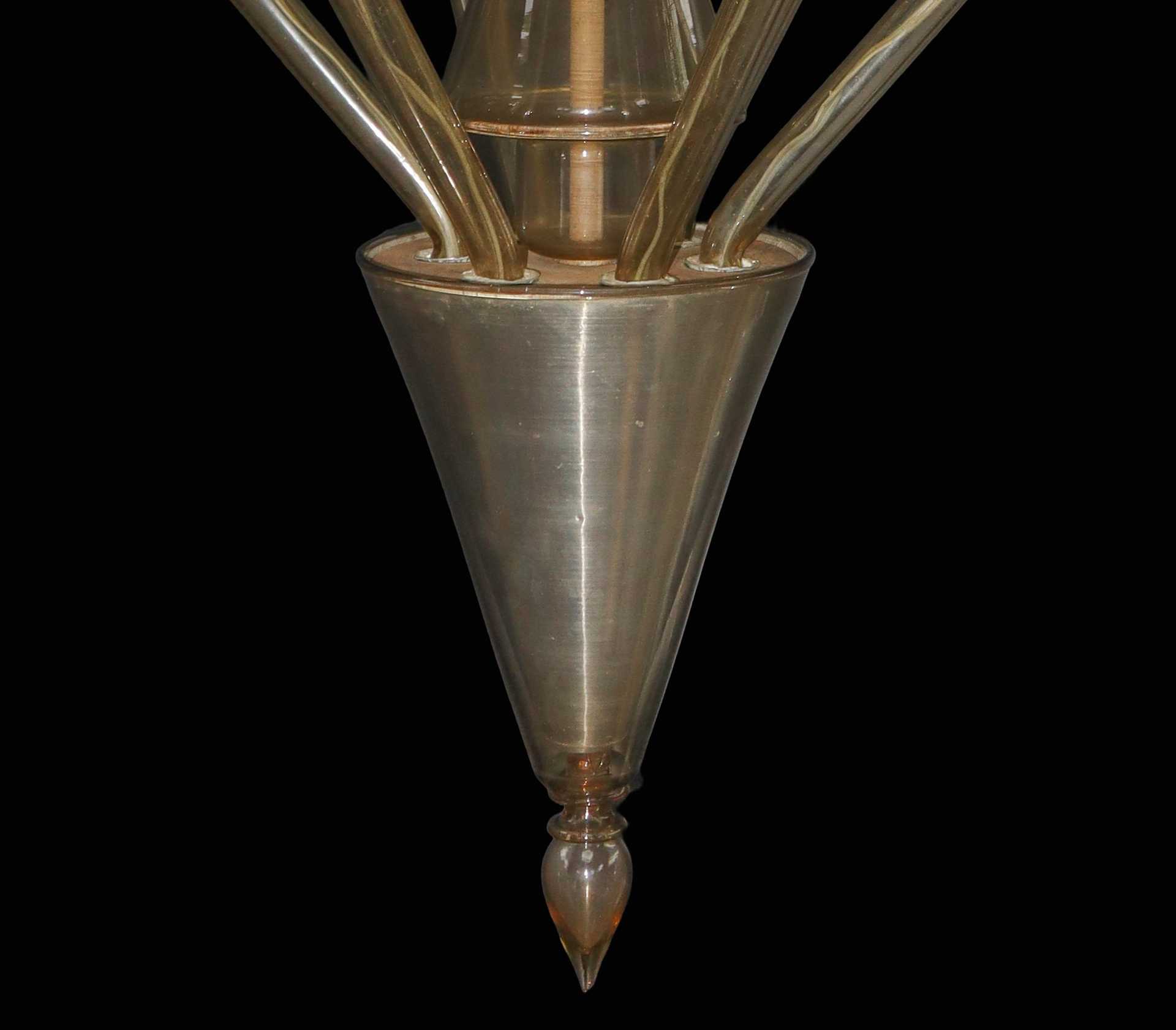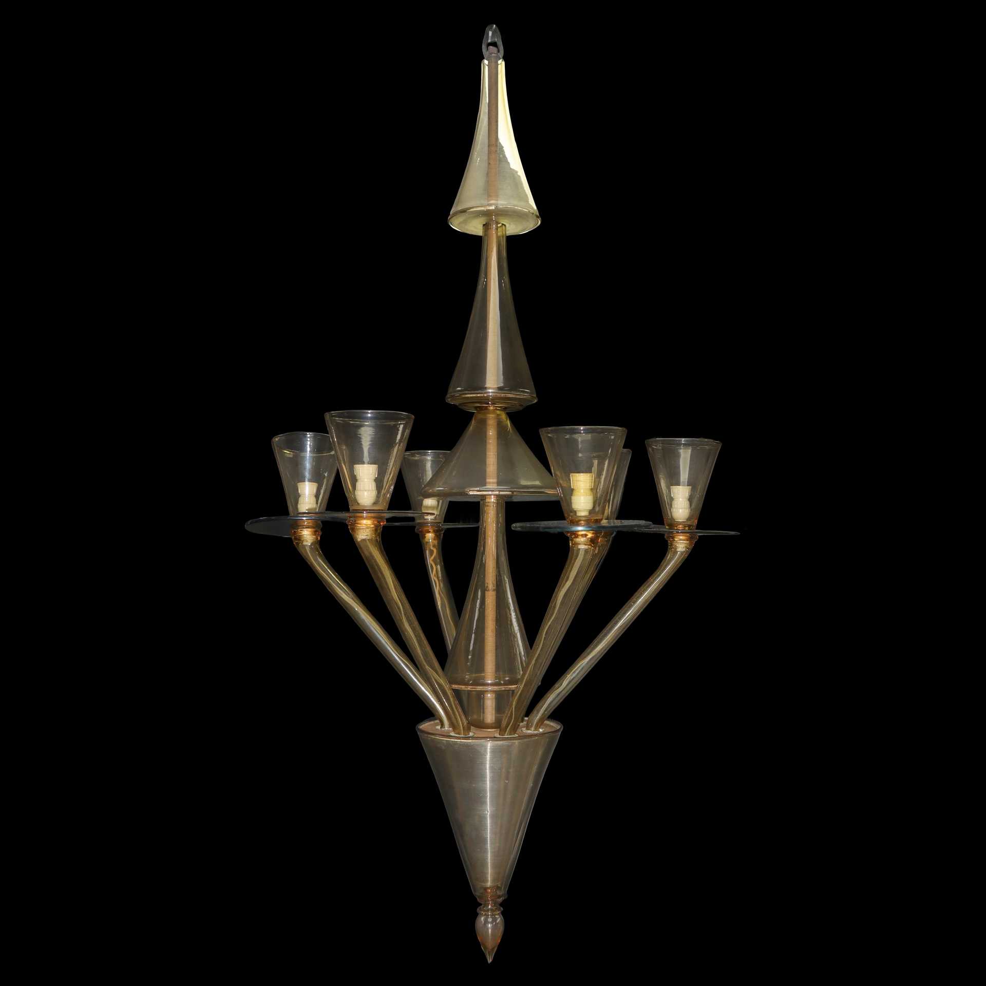 Lampadario decò a sei luci in vetro di Murano. h cm 124X63 Presenti piccole rotturePresenti piccole rotture