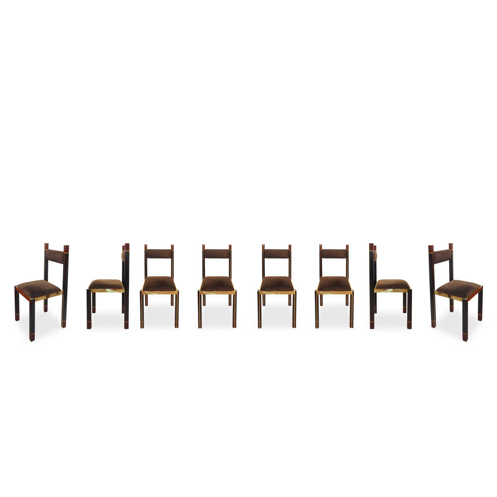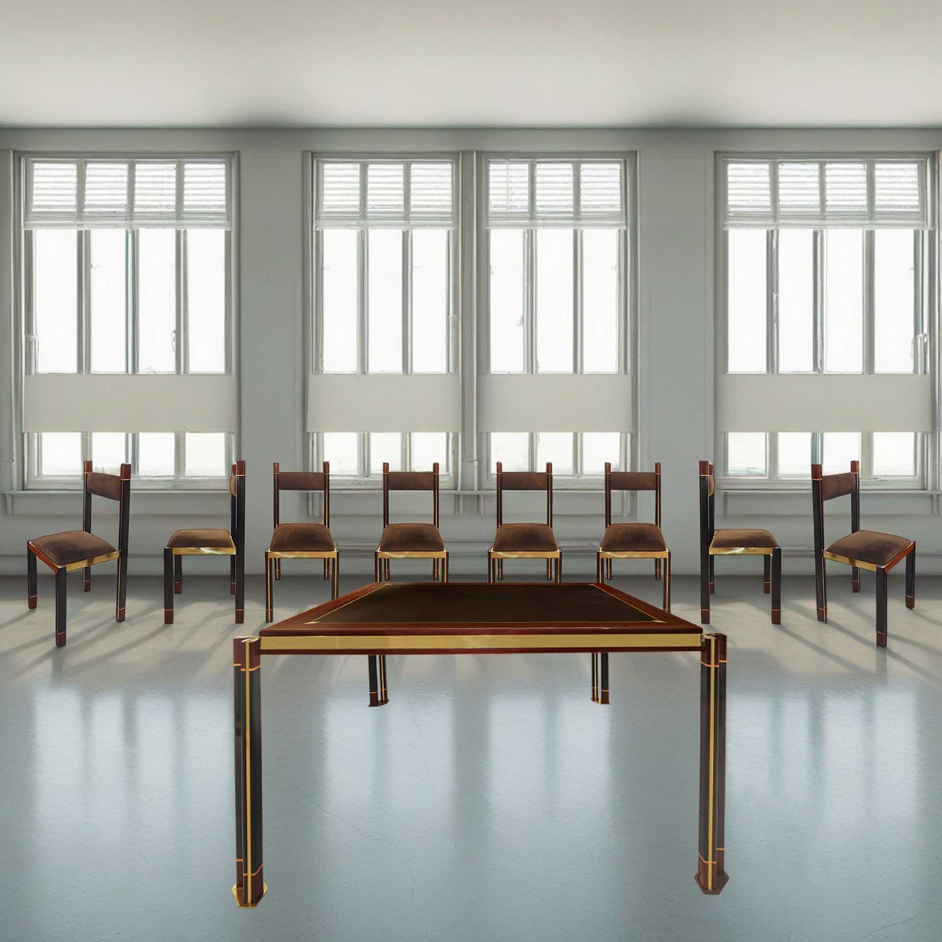 Paolo Barracchia per Roman Decò - Tavolo quadrato e 8 sedie in ottone rivestito in legno laccato e intarsiato, 1970-1979