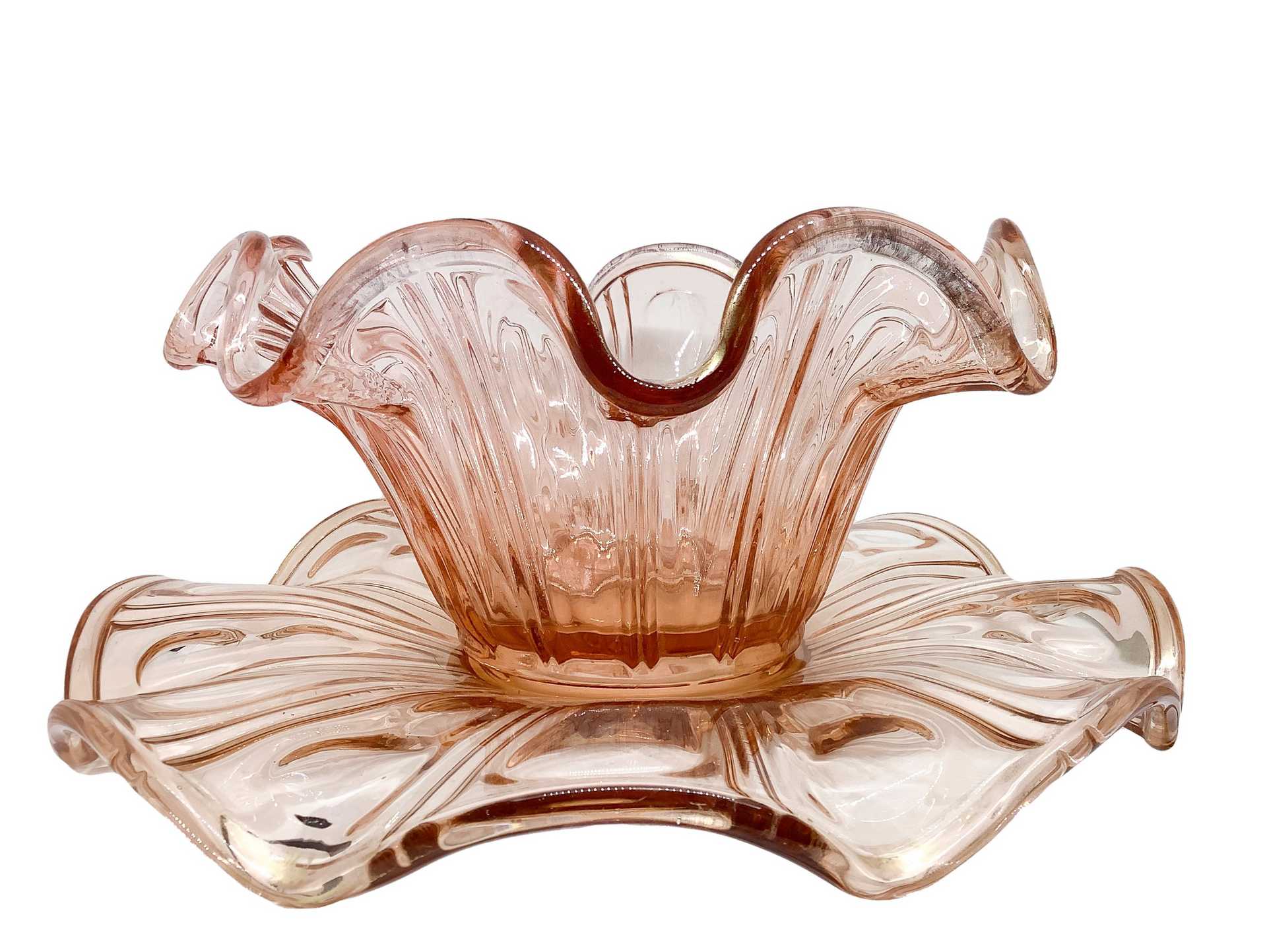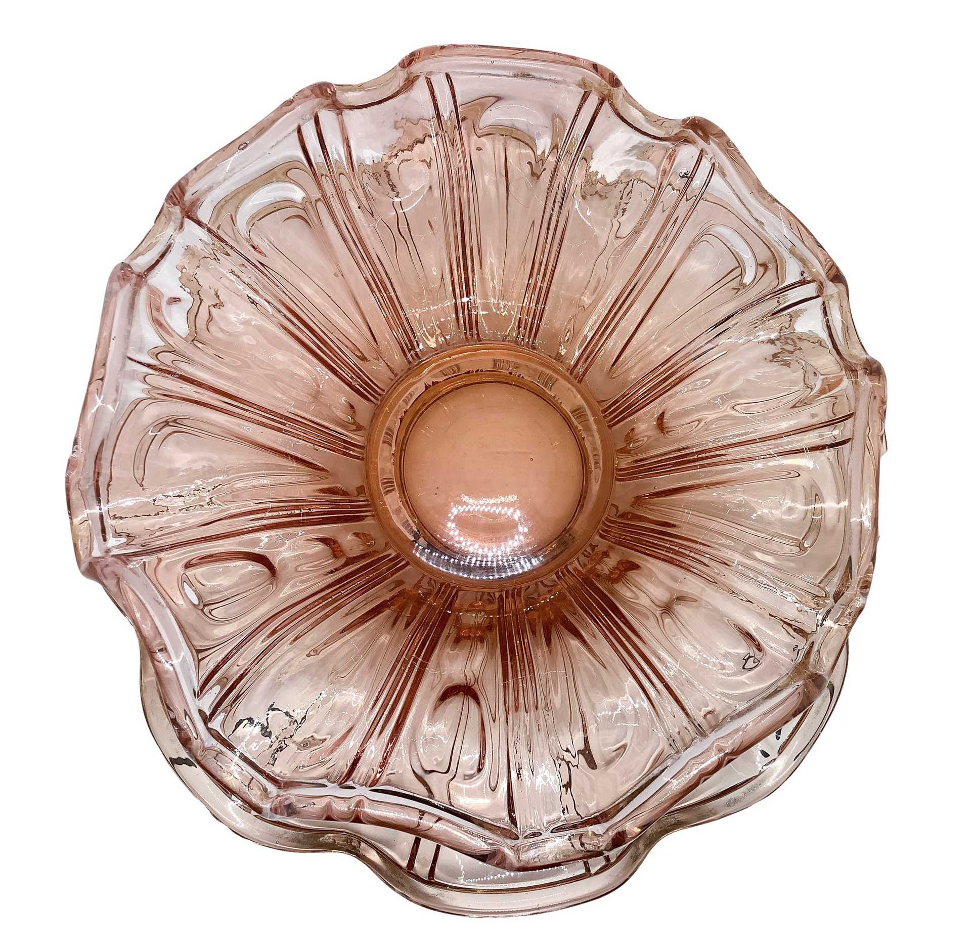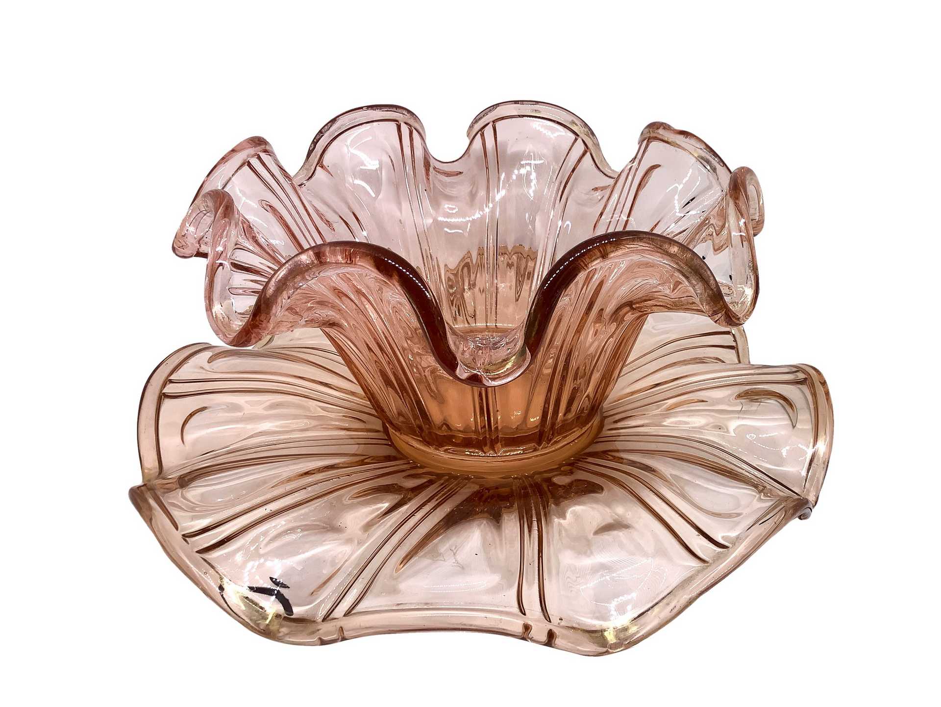 Centrotavola formato da piatto più alzata d 34 cm, b 11 cm, h 24 cm In vetro rosa e stile Liberty. Minima filaturaIn vetro rosa e stile Liberty. Minima filatura