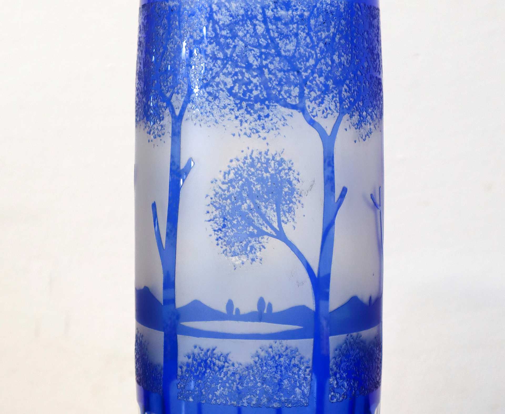 Wilhelm Kralik - Vaso decò in vetro Bohemian, 1920 H cm 30, base cm 10 Decorato all'acido con paesaggi ed alberi nei toni del bluDecorato all'acido con paesaggi ed alberi nei toni del blu