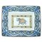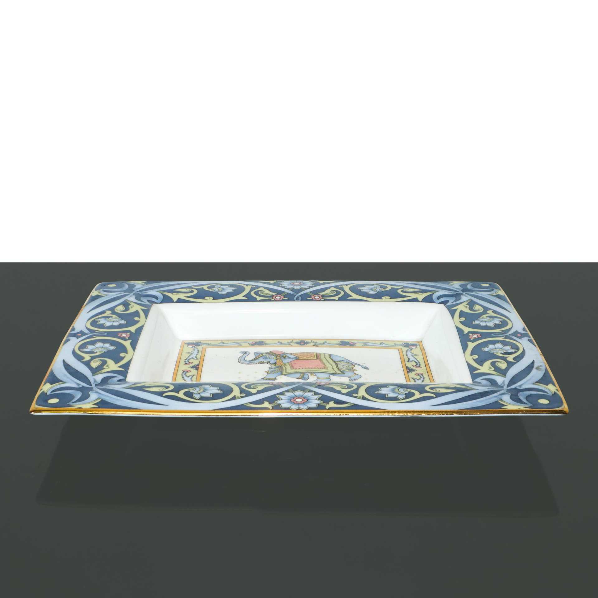 Wedgwood Made in England - Trittico in porcellana bone china modello Blue Elephant, composto da posacenere, orologio, scatola portaoggetti con carte da gioco, 1992 Posacenere cm 20x16, Orologio H cm 9 Portaoggetti H12x13,