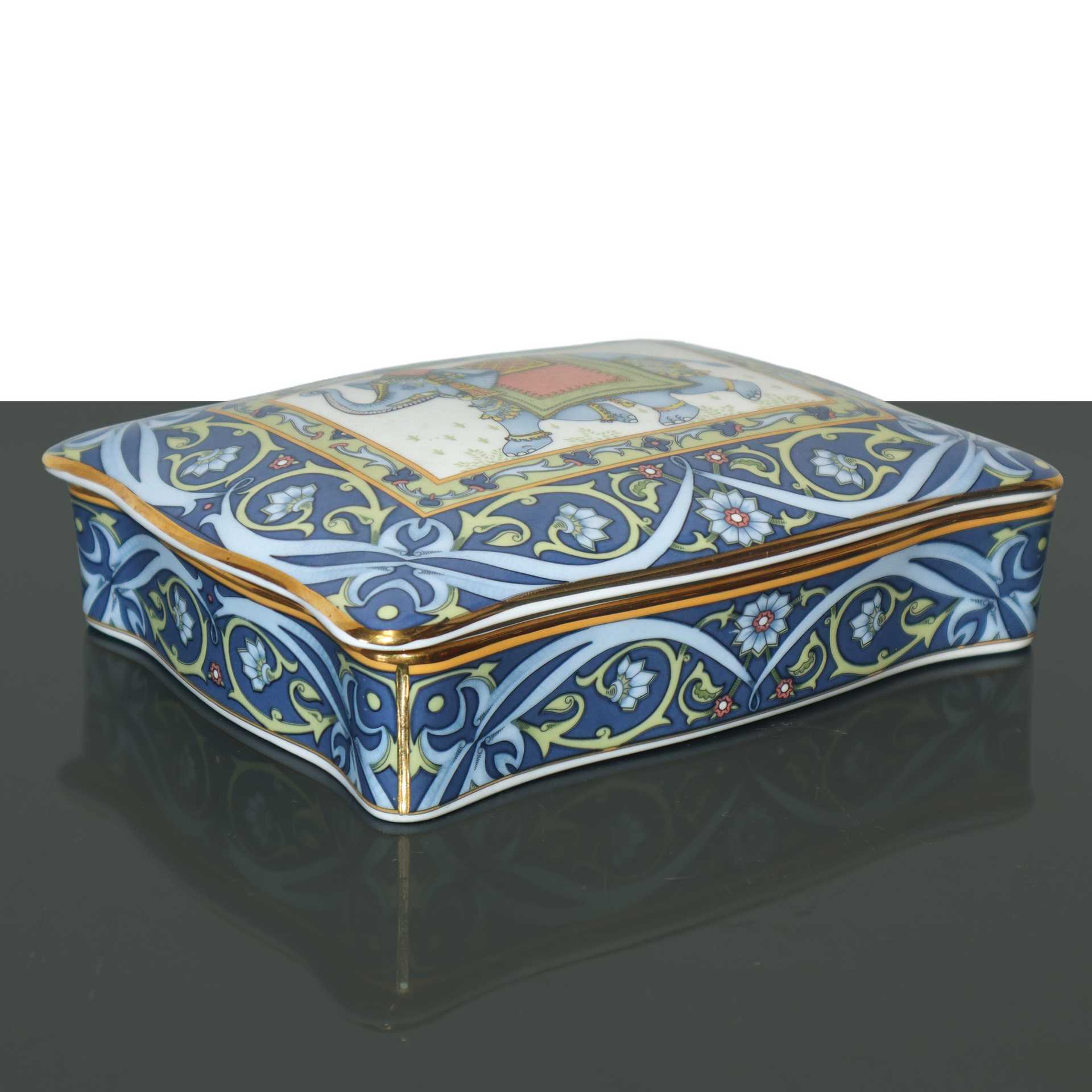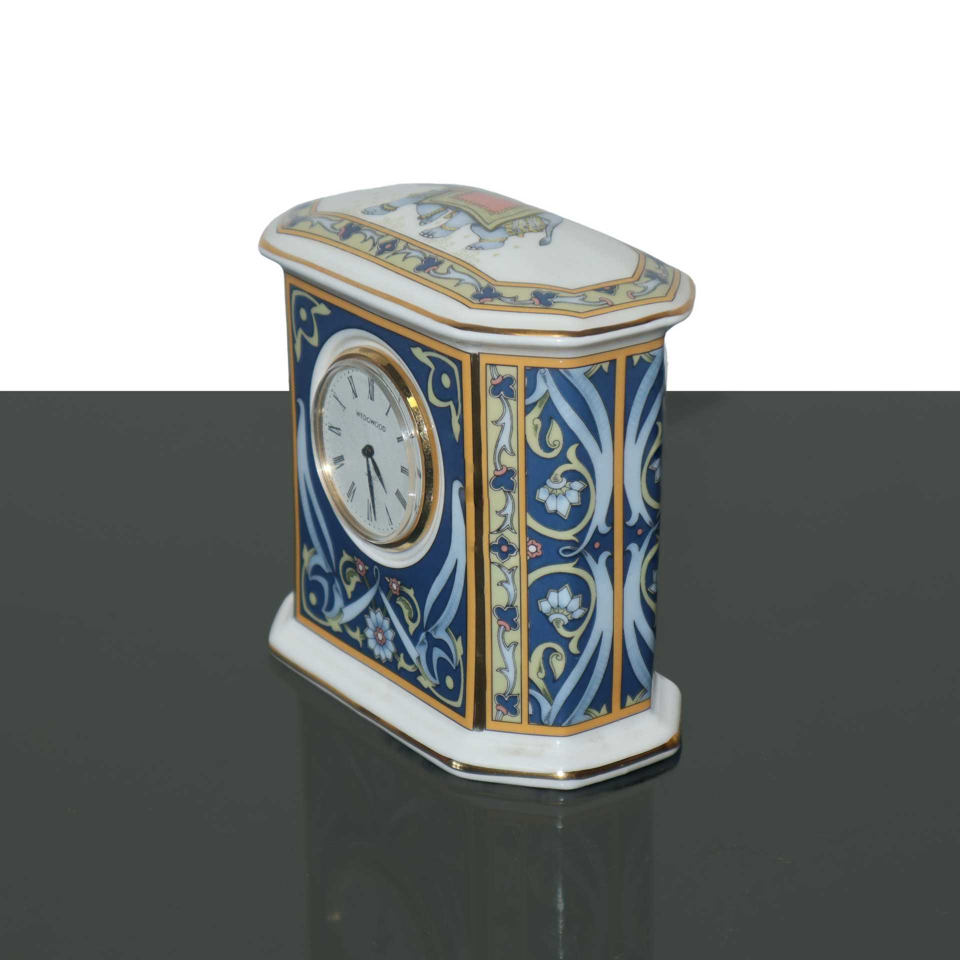 Wedgwood Made in England - Trittico in porcellana bone china modello Blue Elephant, composto da posacenere, orologio, scatola portaoggetti con carte da gioco, 1992