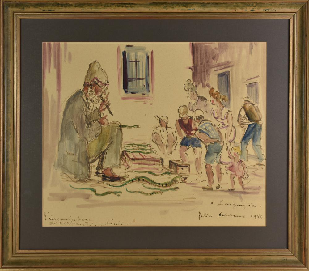 Felice Vellan L'INCANTATORE DI SERPENTI...FINTI, 1984 acquerello su carta, cm...