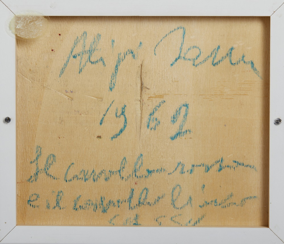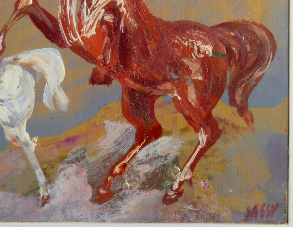 SASSU ALIGI (1912 - 2000) IL CAVALLO ROSA E IL CAVALLO BIANCO. 1962. olio su tavola. Cm 18,00 x 15,00. firma