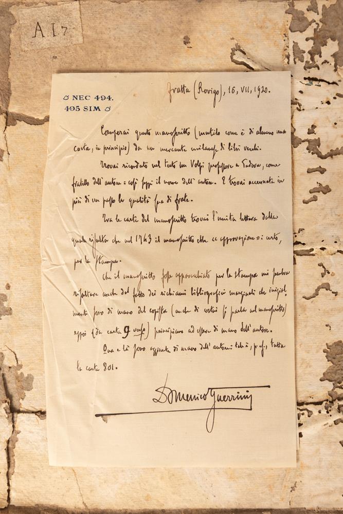 al contropiatto è incollata una lettera autografa del generale Domenico Guerrini, relativa alle vicende del manoscritto.