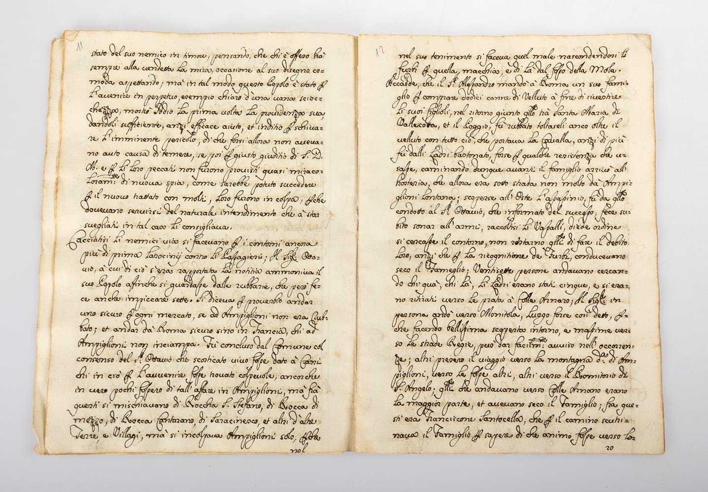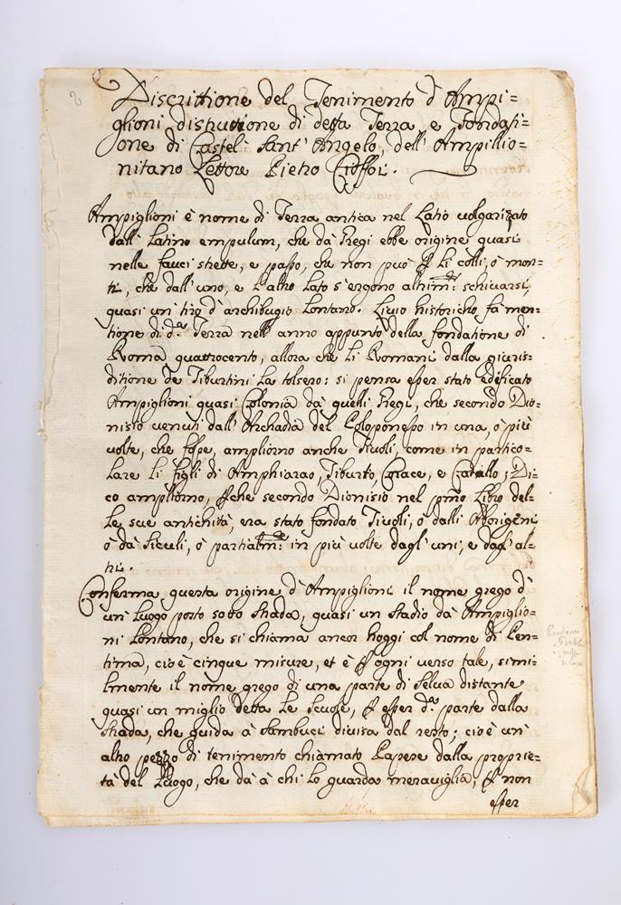 Pubblicazione: Prima metà del XVII° secolo (1638 circa) Descrizione: manoscritto formato 4°, senza legatura, pp. 22, in buone condizioni, opera storico-locale inedita del Cioffi su Ampiglione (lʹodierna Castel Madama).