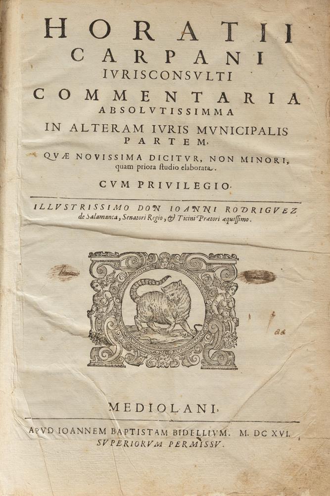 Volume in-folio, rilegato in pergamena coeva, pp. [8], 302, [226], esemplare in buone condizioni, volume secondo monografico dellʹopera ʺLeges et statuta ducatus Mediolanensisʺ, contenente gli statuti della città di Milano.