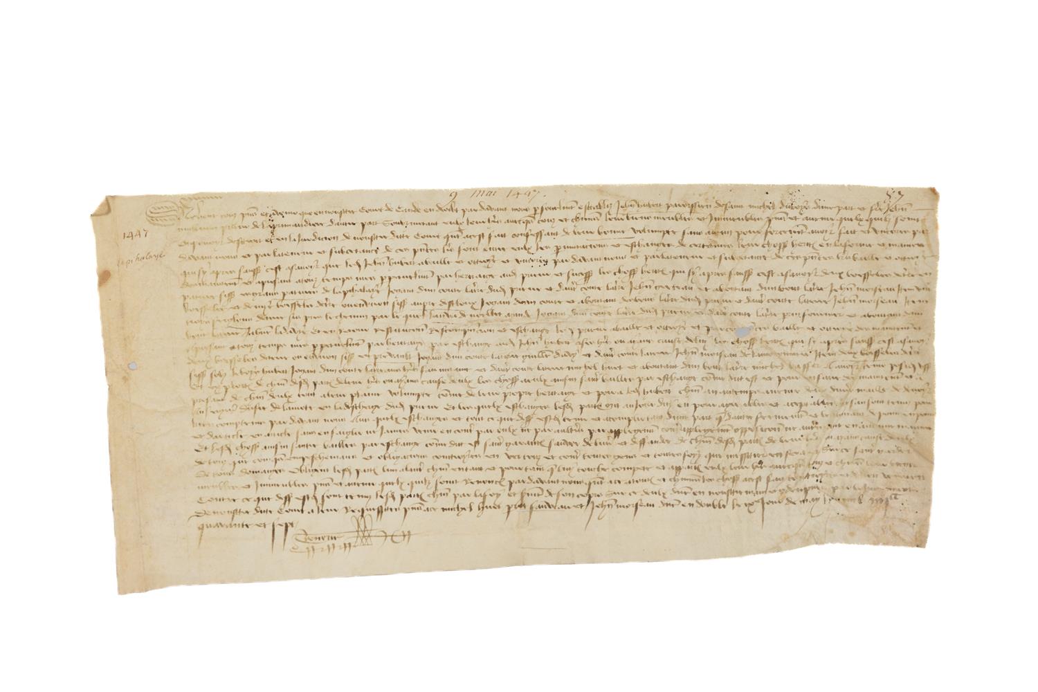 Manoscritto su pergamena, formato 36 x 17 cm., testo in lingua francese, in buone condizioni.