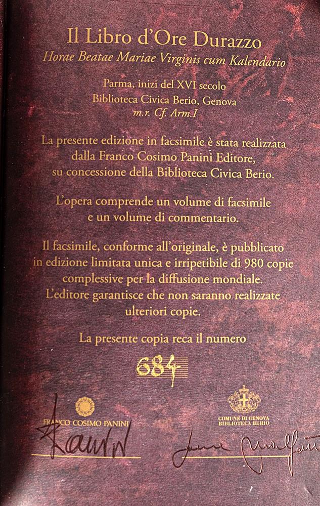 Libro d’Ore Durazzo (Durazzo Book of Hours; Offiziolo Durazzo; Horae Beatae Mariae Virginis, cum Kalendario). Genova, Biblioteca Civica Berio (m.r. C.f. Arm. I).