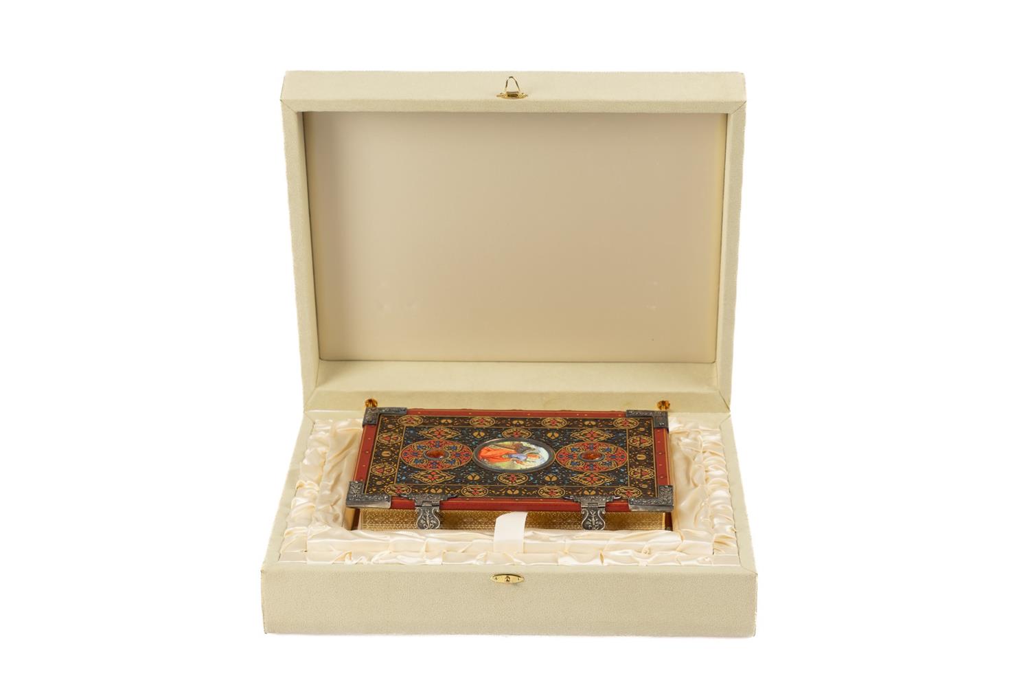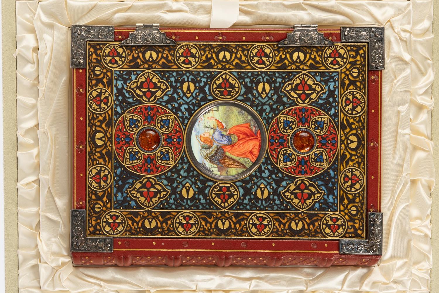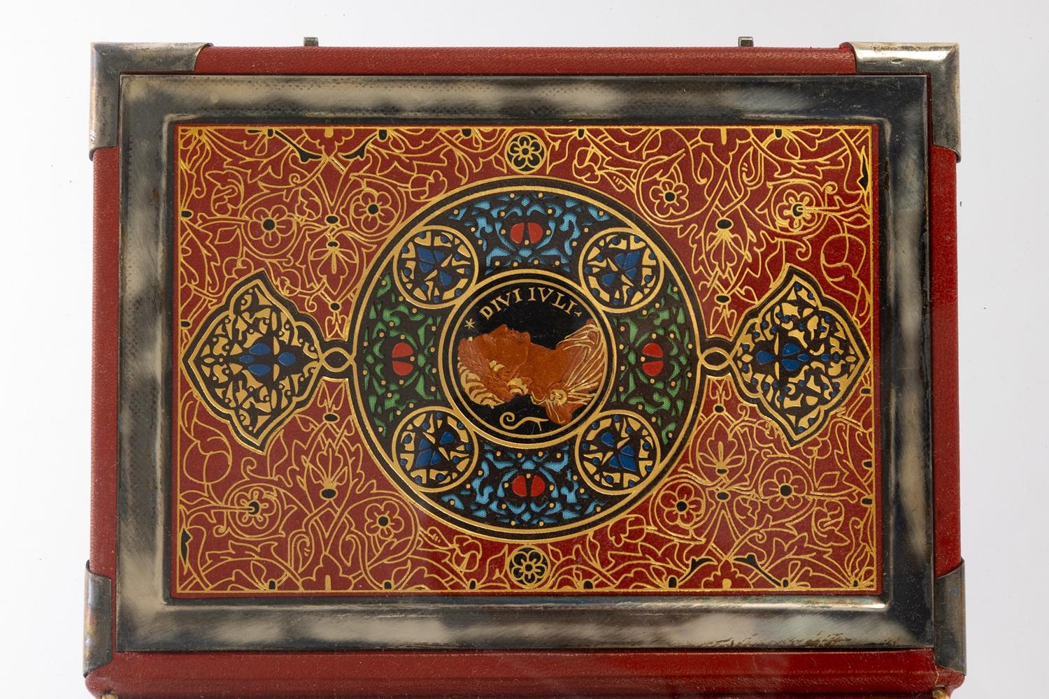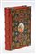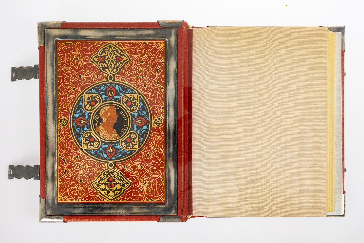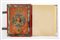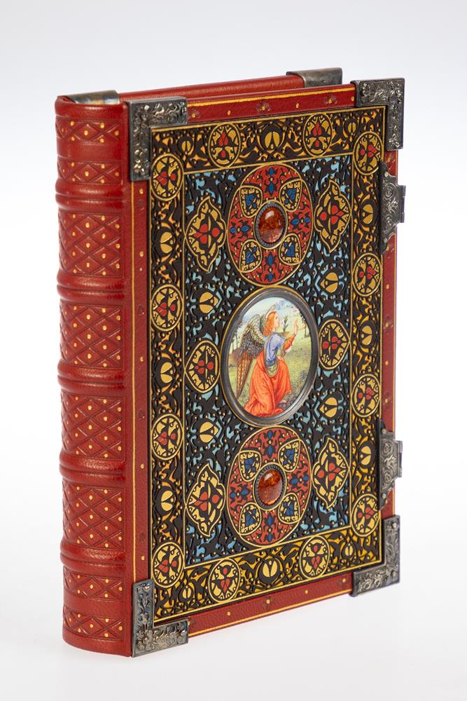 Interni delle copertine incorniciati in argento massiccio, con decorazioni policrome e impressioni in oro su intagli di pelle, due tondi centrali in cuoio lavorati a bassorilievo