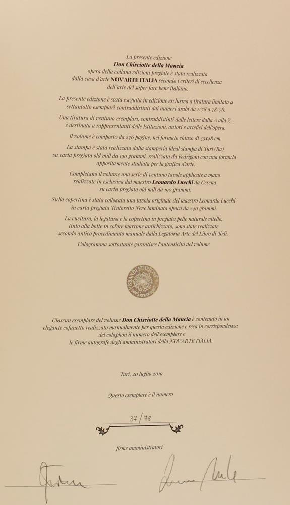 Nov'Arte Italia, Turi (BA), 2019 Volume in-folio grande, rilegato in piena pelle, titolo e fregi in oro al dorso, nervi a rilievo, piatto anteriore illustrato, pp. 269, esemplare n. 37/78 esemplari, in pregiata custodia editoriale telata, in ottime condizioni.