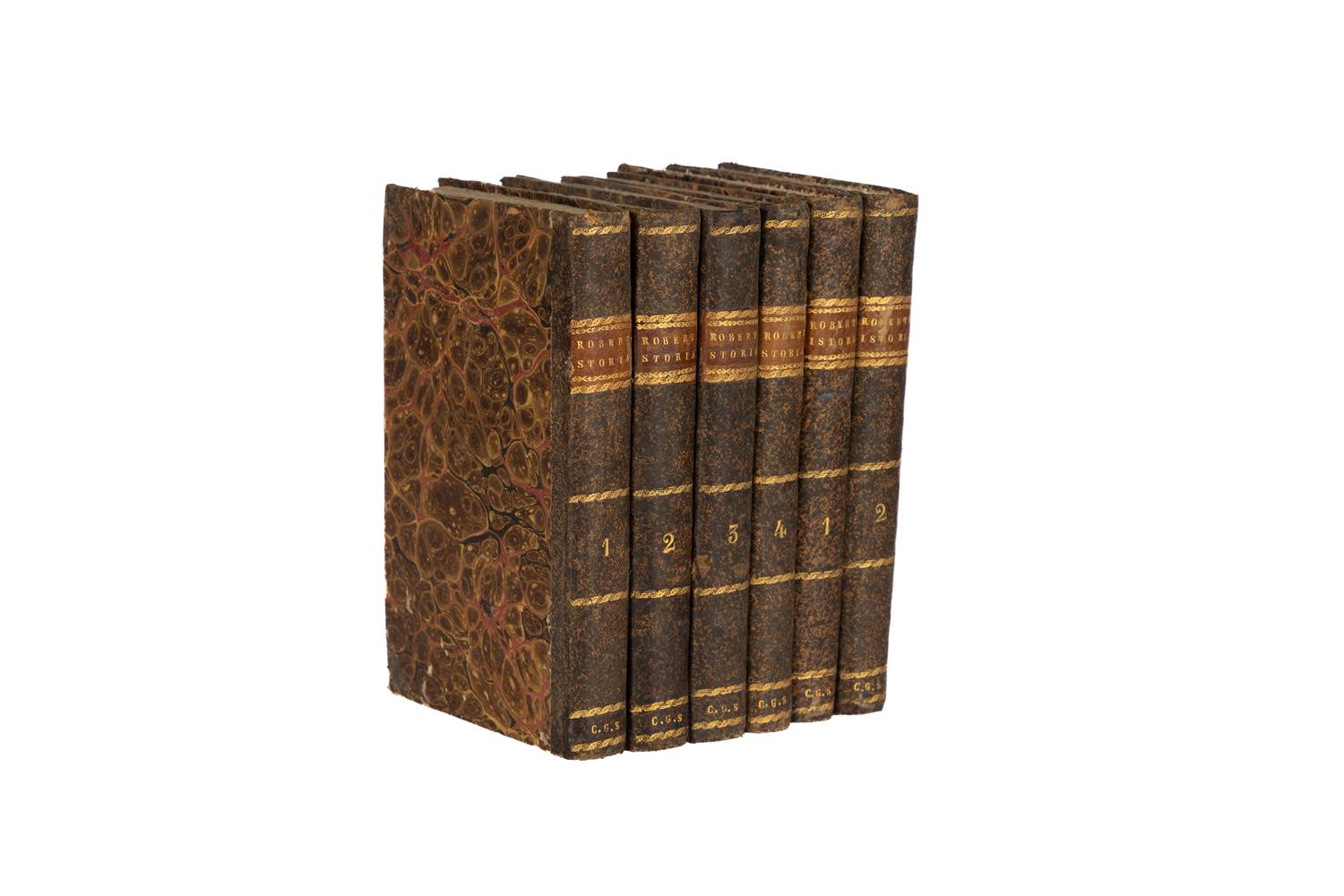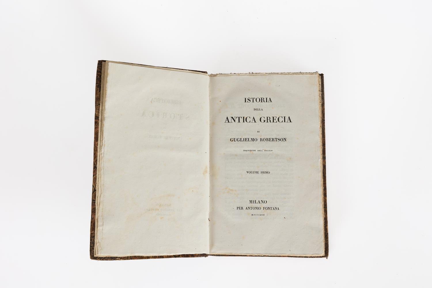 2) Robertson - Istoria della antica Grecia - Milano, 1831. Descrizione: volumi formato 8°, rilegati in mezza pelle coeva, titoli e fregi in oro ai dorsi, esemplari in buone condizioni, lievi bruniture, fioriture, legature con tracce dʹuso.