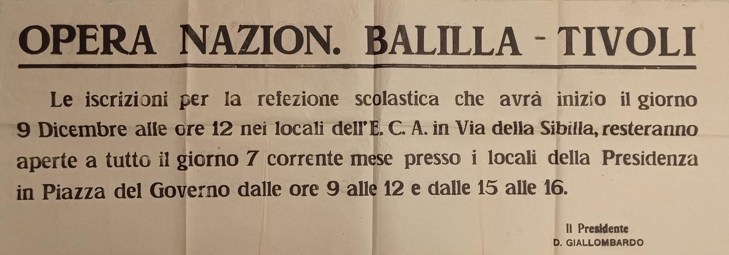 Manifesto dellʹOpera Nazionale Balilla di Tivoli per le iscrizioni alla refezione scolastica firmato dal Presidente D. Giallombardo