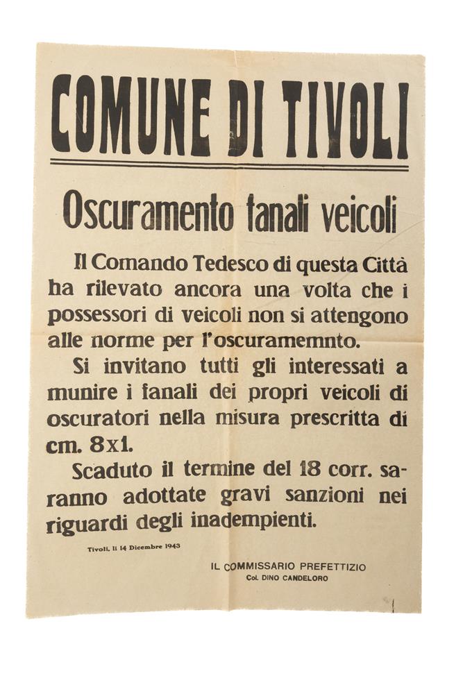 circa lʹoscuramento dei fanali dei veicoli. Tivoli, 14 dicembre 1943. Descrizione: manifesto formato 64x44 cm., in buone condizioni, pieghe.