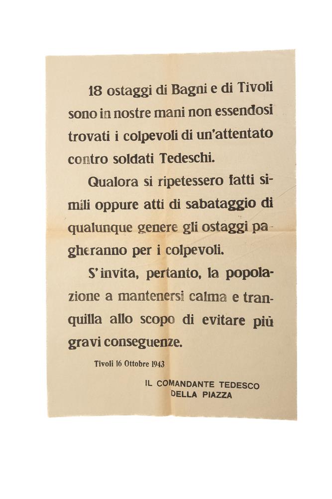 Manifesto di rappresaglia del Comandante tedesco di Tivoli annunziante la sorte dei 18 ostaggi di Bagni e Tivoli che verranno giustiziati in caso del ripetersi di episodi di sabotaggio a danno delle truppe tedesche. Tivoli, 16 ottobre 1943.