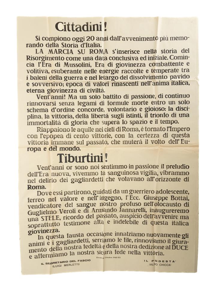 Manifesto del Podestà di Tivoli Aldo Chicca e del Segretario del Fascio Luigi Merletti per la commemorazione