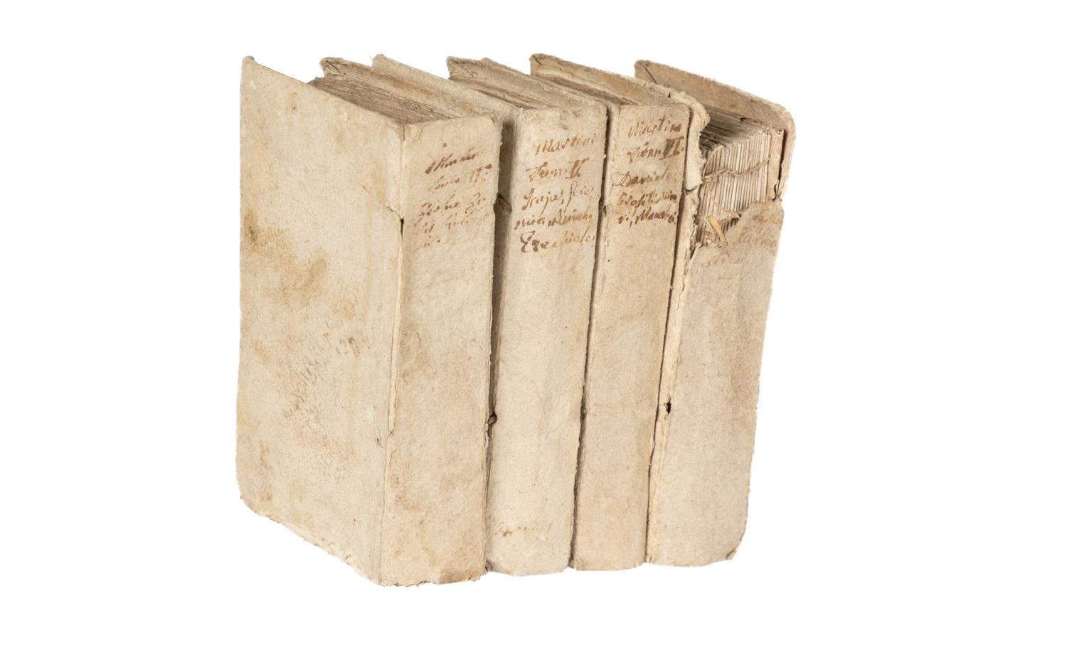 Quattro volumi formato 8°, rilegati in cartonato coevo, esemplari in discrete condizioni, tracce dʹumidità e muffe ad un volume, dorso di un volume con mancanze.