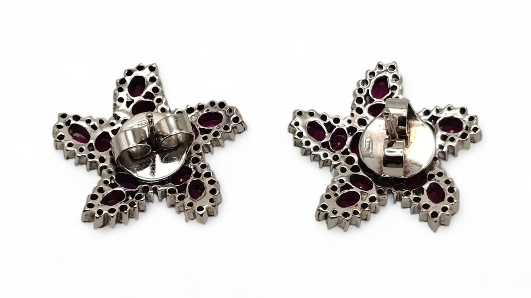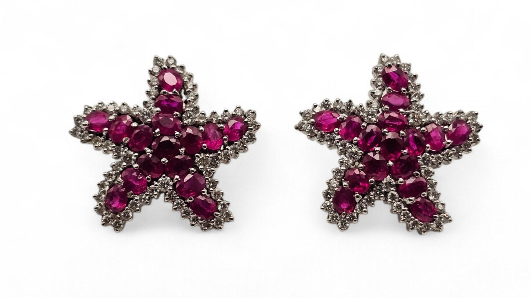 Paio di orecchini a motivo di stella marina in oro, rubini e diamanti