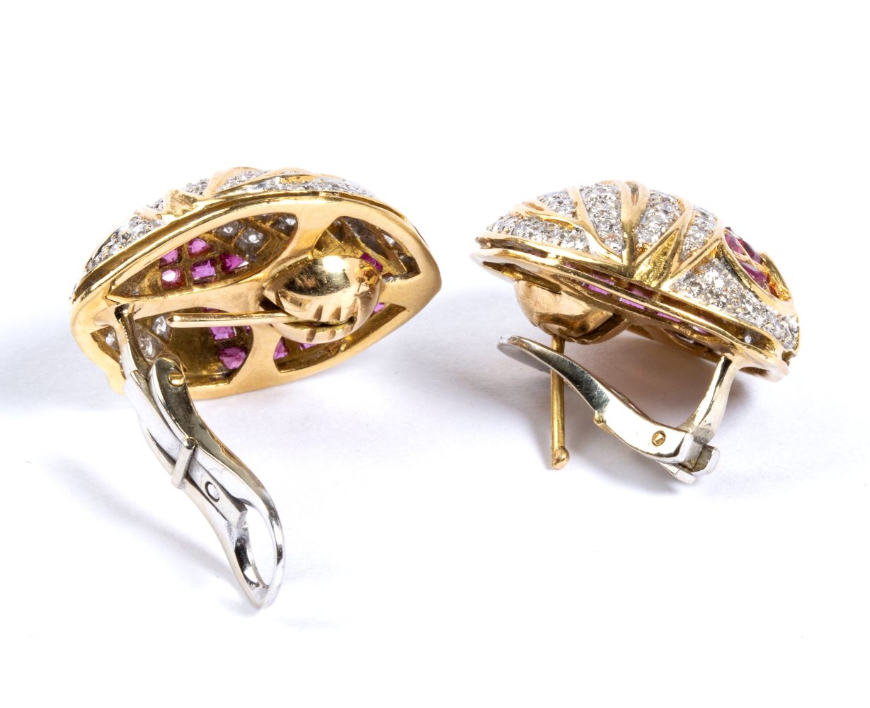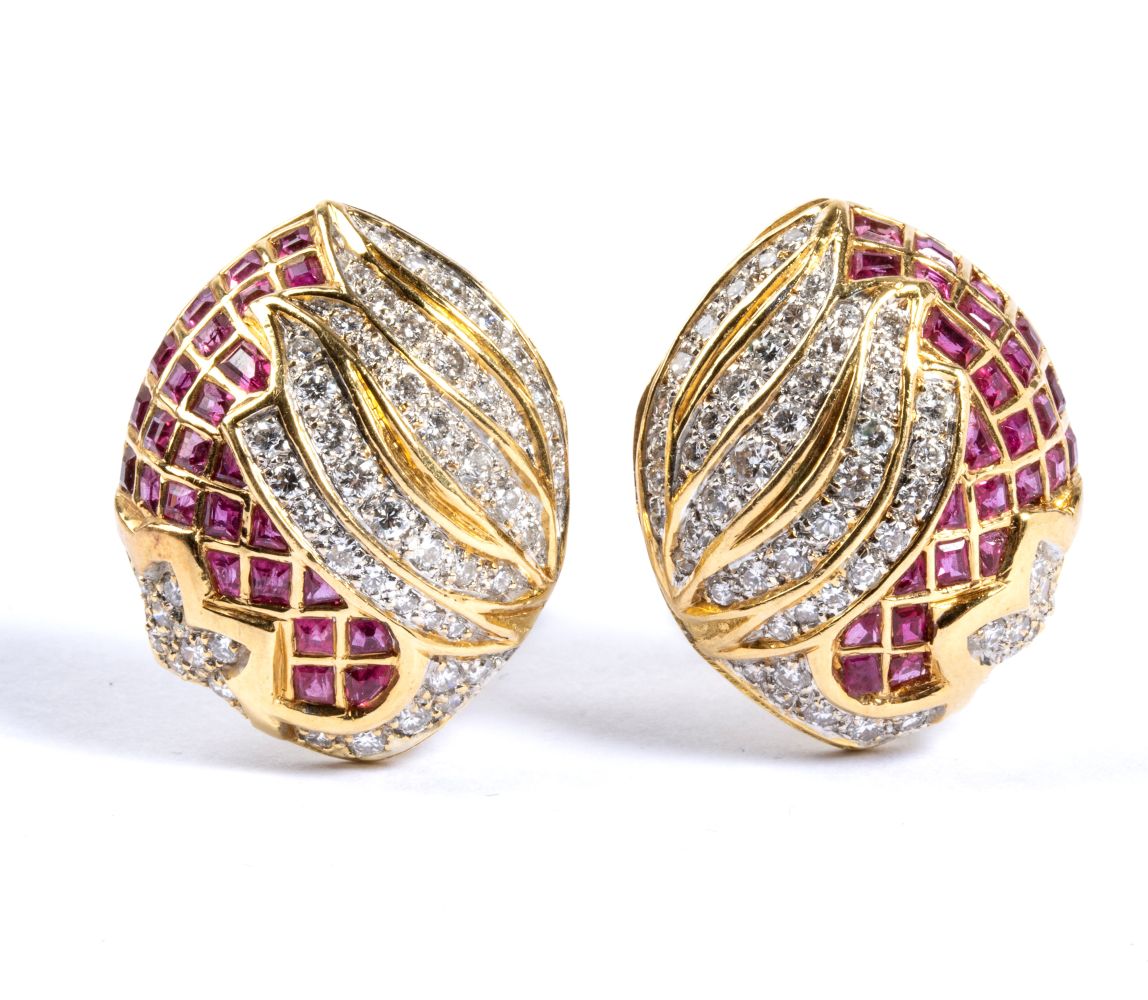 in oro giallo, con motivo di nastri in diamanti taglio brillante e pavé di rubini carrè.