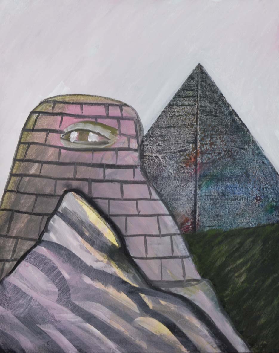ZOTTI CARMELO Trieste 1933 - Treviso 2007 Piramide e sfinge 1975 olio su tela 50x40 data in basso a sinistra firma e data al retro