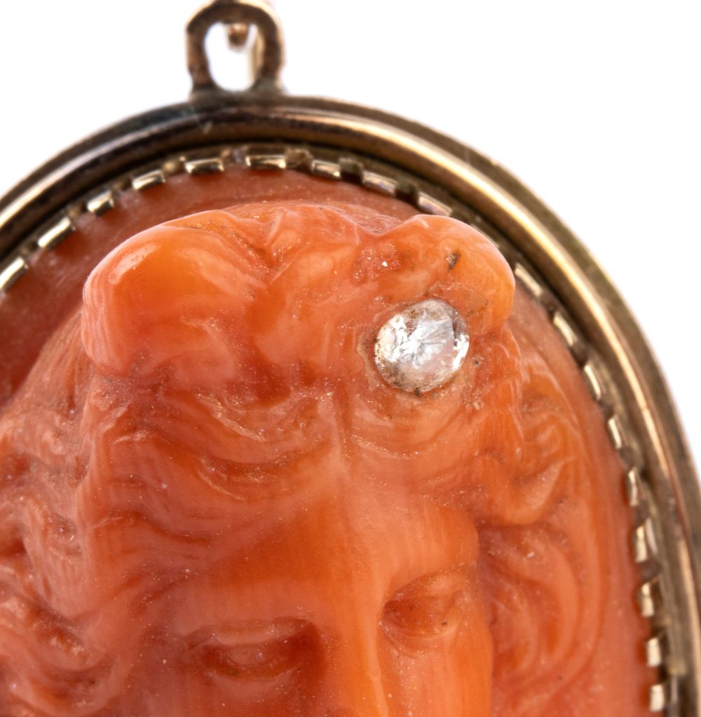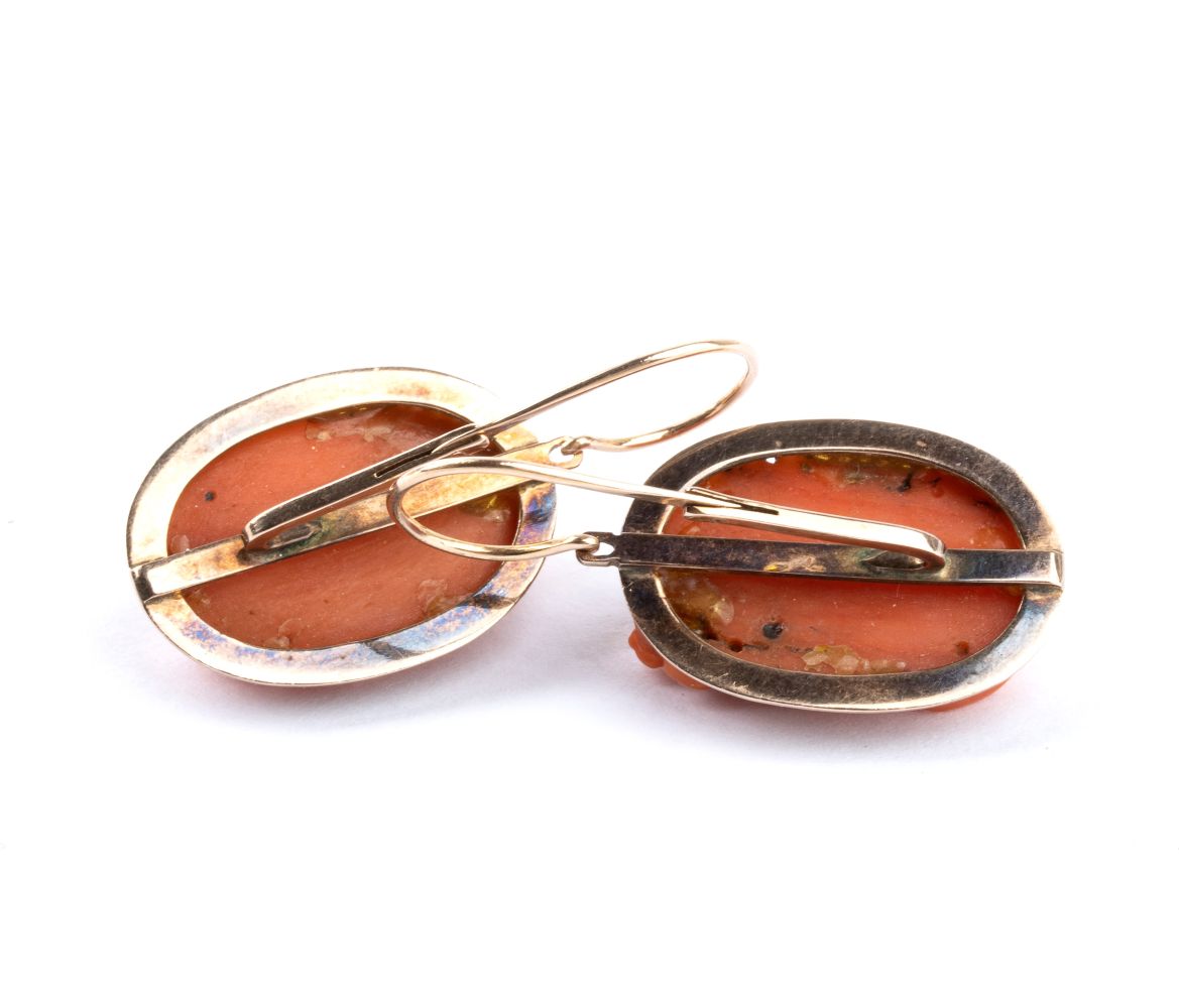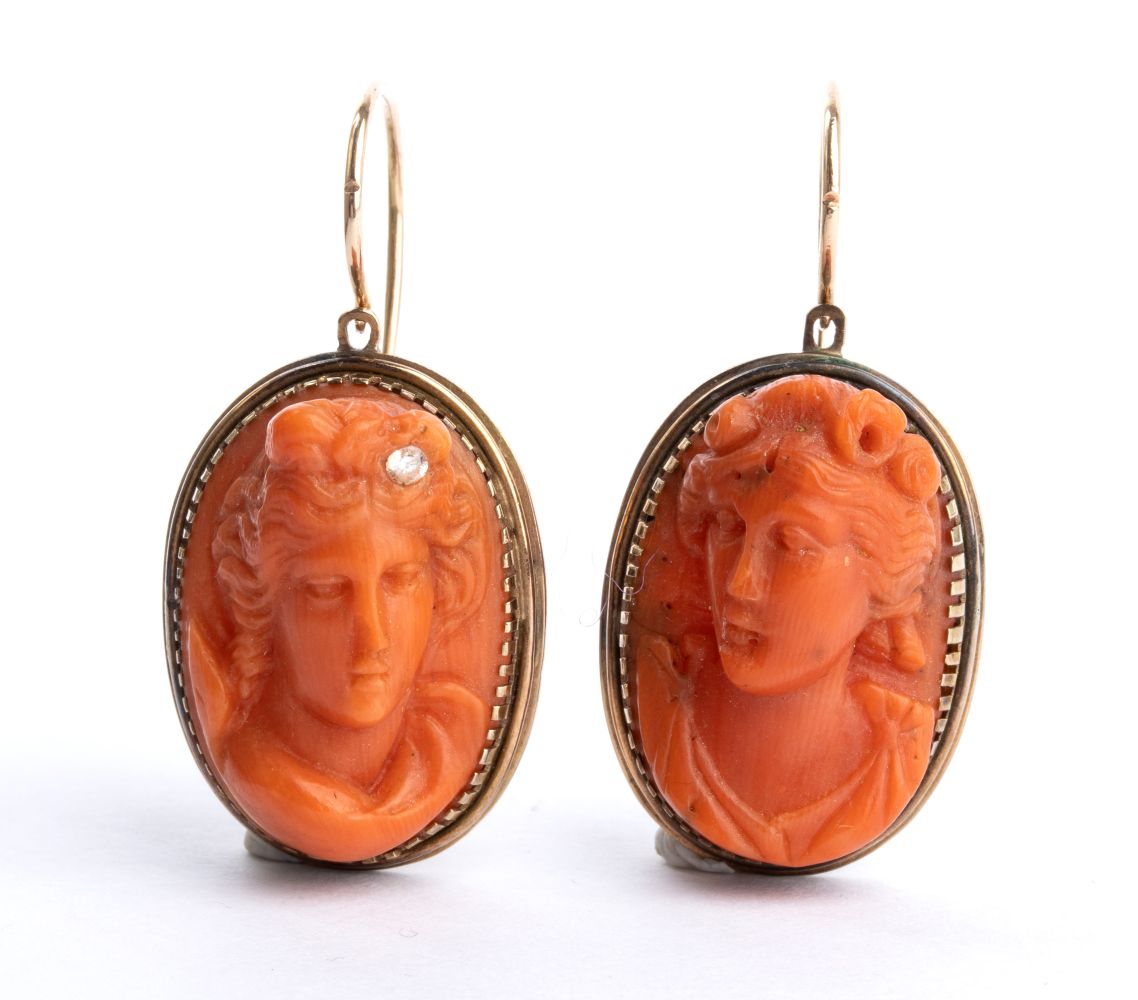 montature in oro a basso titolo che incorniciano due cammei in corallo rosso del Mediterraneo (Corallium Rubrum) raffiguranti due volti di donna posti a tre quarti, dai capelli adornati di fiori. In una delle acconciature è presente n. 01 diamante di forma rotonda, taglio brillante.