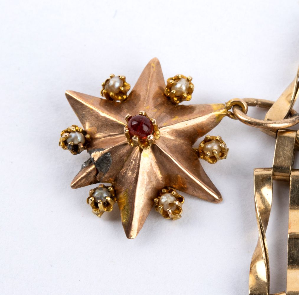 in oro a basso titolo, composto da una catena con chiusura di sicurezza, decorata con ciondoli raffiguranti un cammello smaltato, un piccolo cammeo, una medaglietta con un bambino, una stella, un lucchetto a forma di cuore e una figura astratta smaltata.