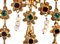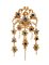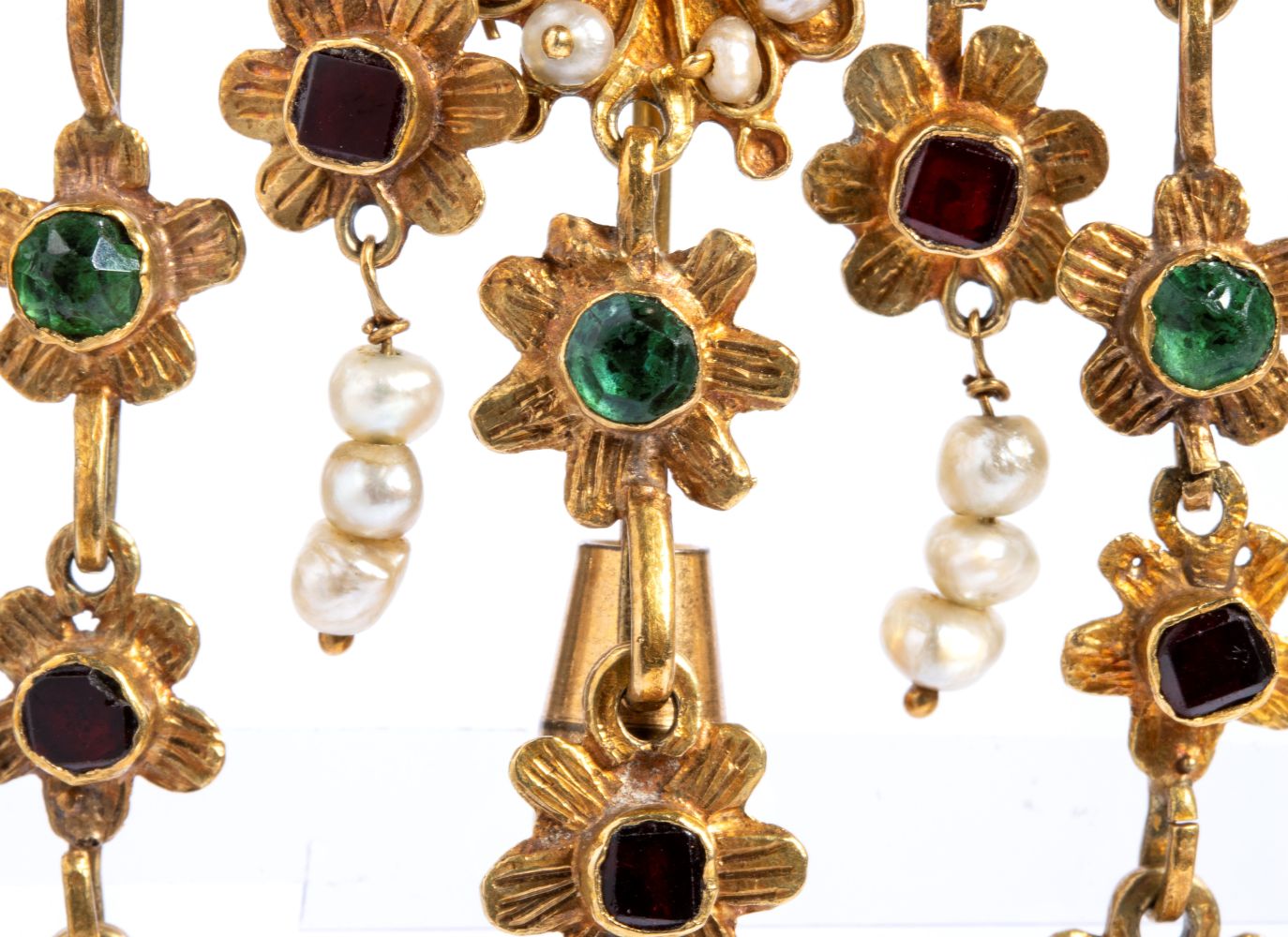 lavorata a traforo a motivi floreali, impreziosita da perle coltivate d'acqua salata e paste vitree rosse e verdi. Chiusura ad inserimento in metallo.