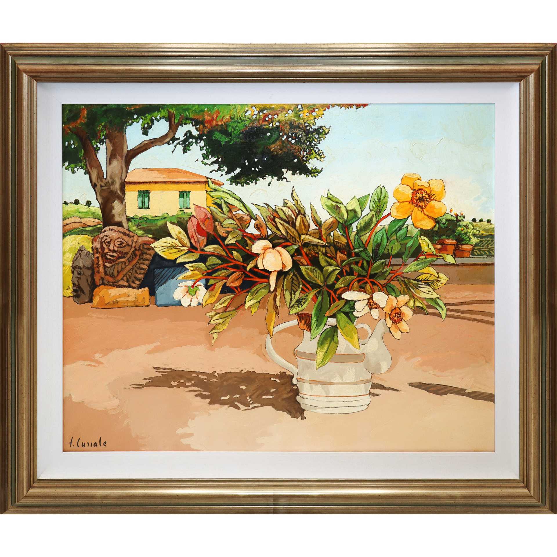 Filippo Curiale - Vaso di fiori con albero e casa Cm 80 x 100 in cornice cm 107 x 127 Olio su tela Firmato F. Curiale in basso a sinistra