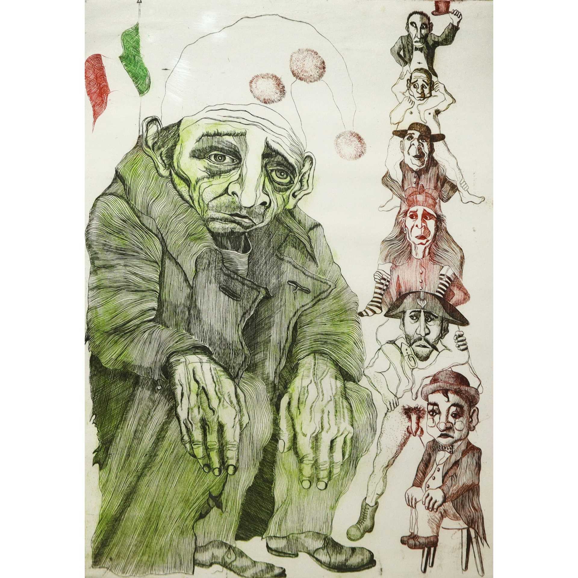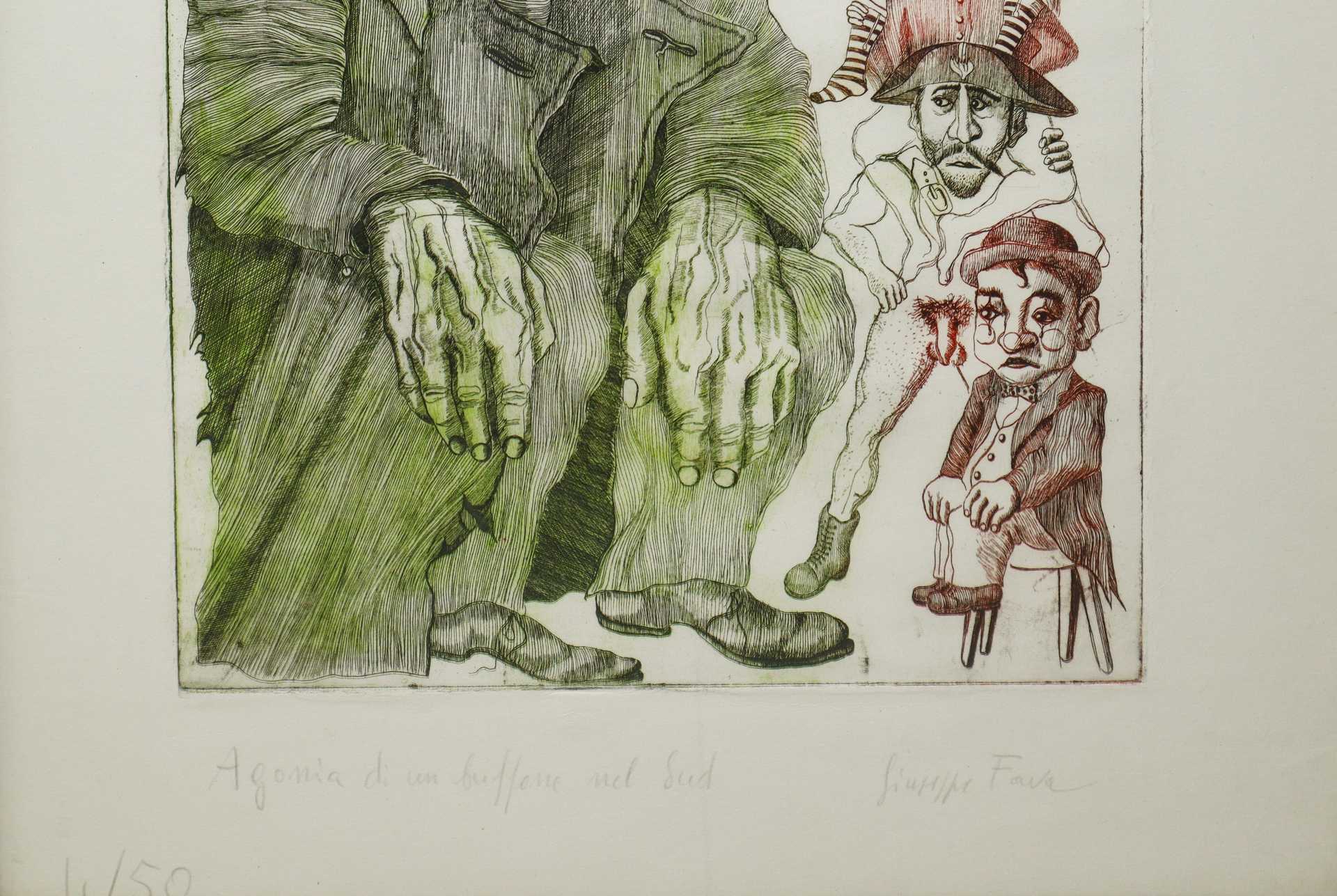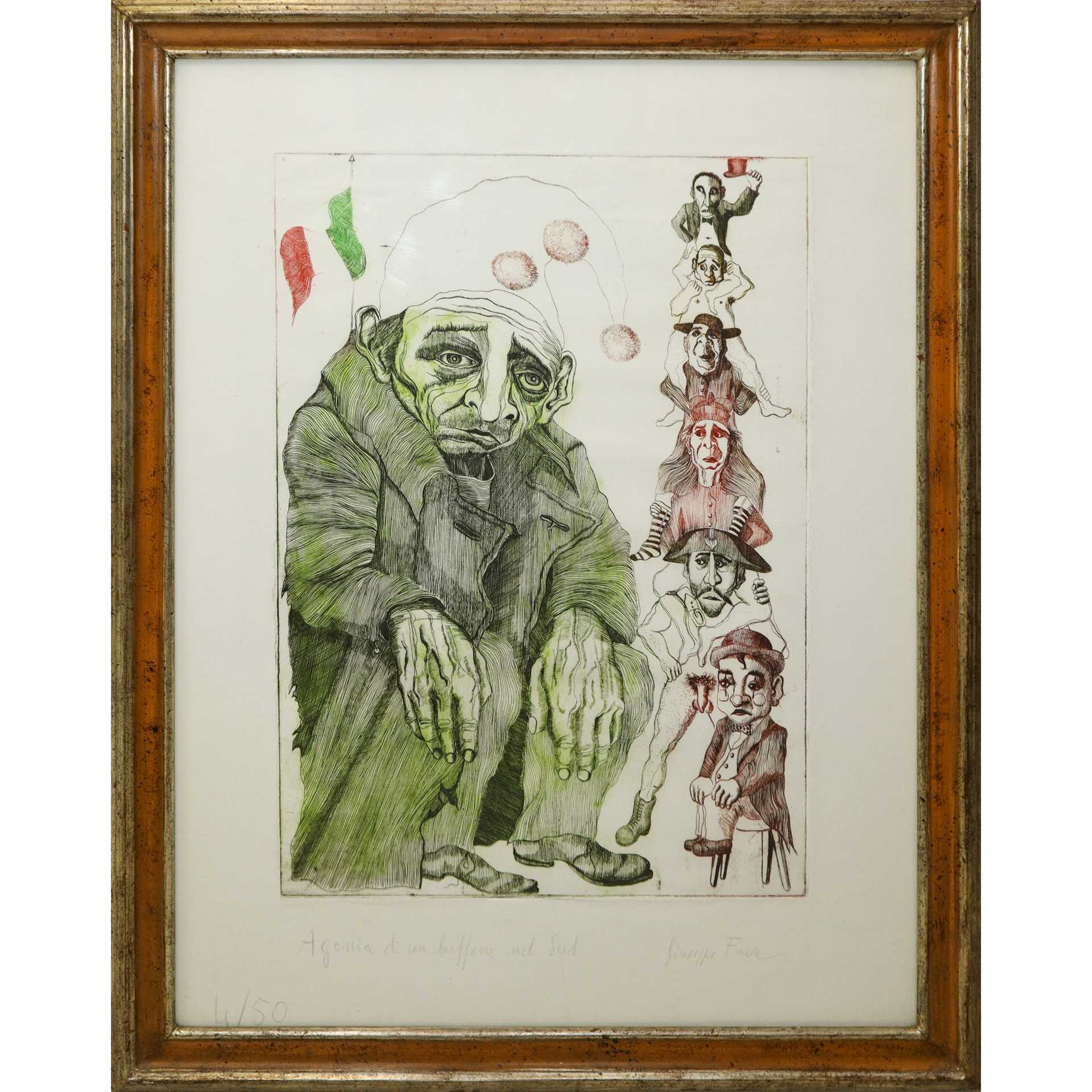 Giuseppe Fava (Palazzolo Acreide 1925-Catania 1984) - Agonia di un buffone del sud h cm 32X47,5 in cornice h cm 53X70 Litografia colorata Firmato e titolato in basso. Tiratura 40/50