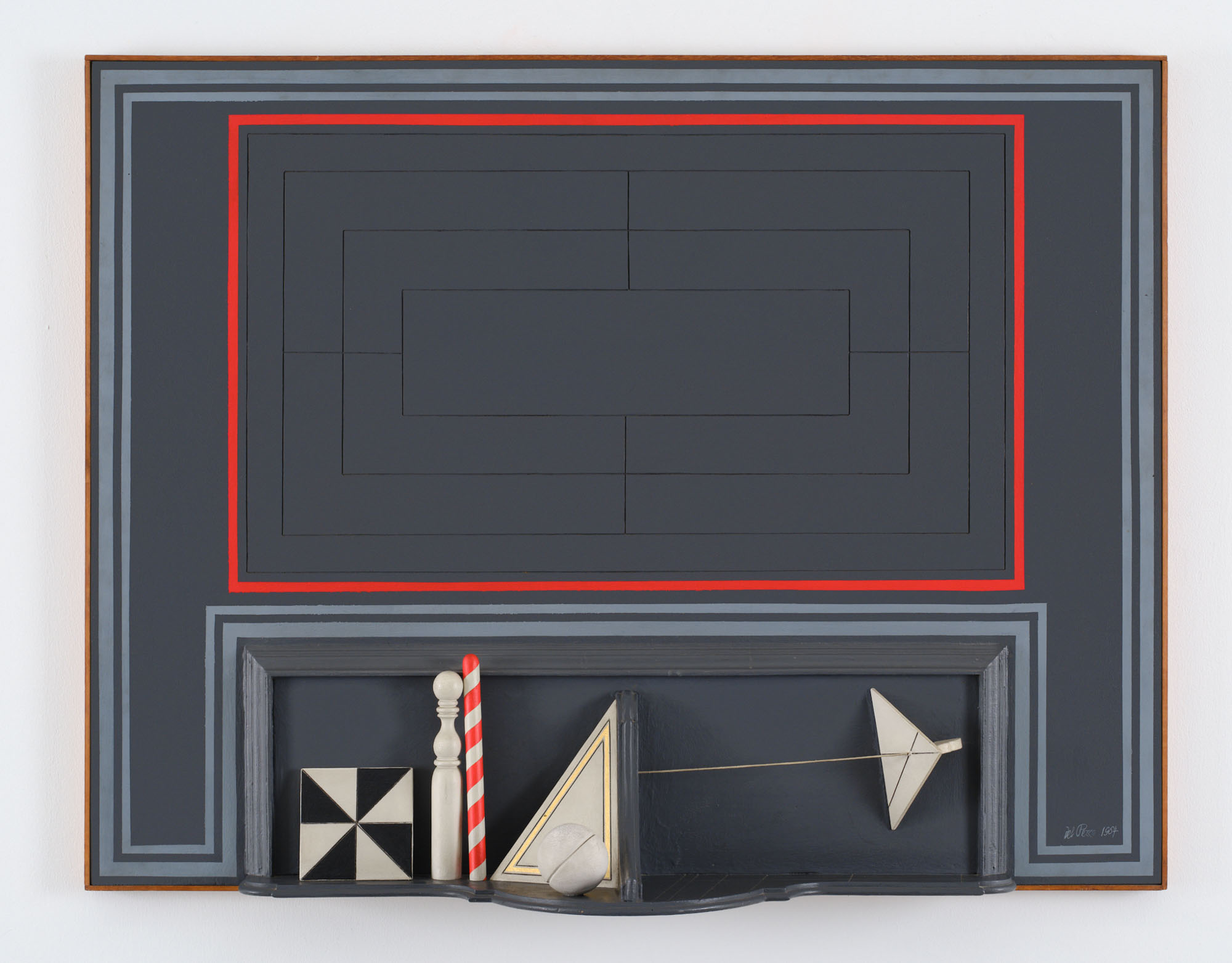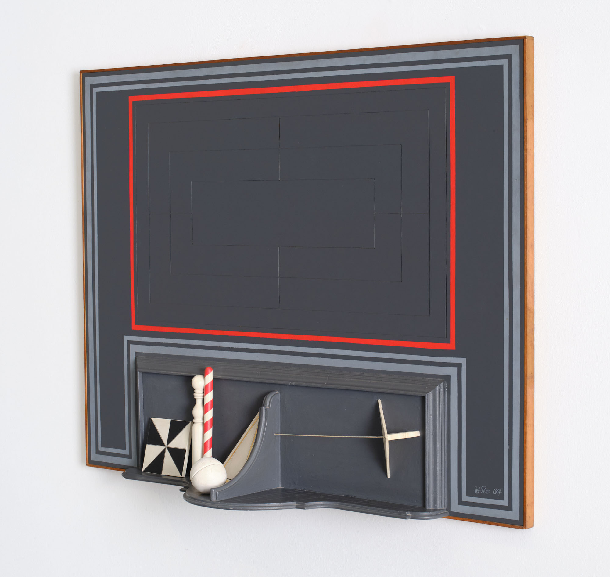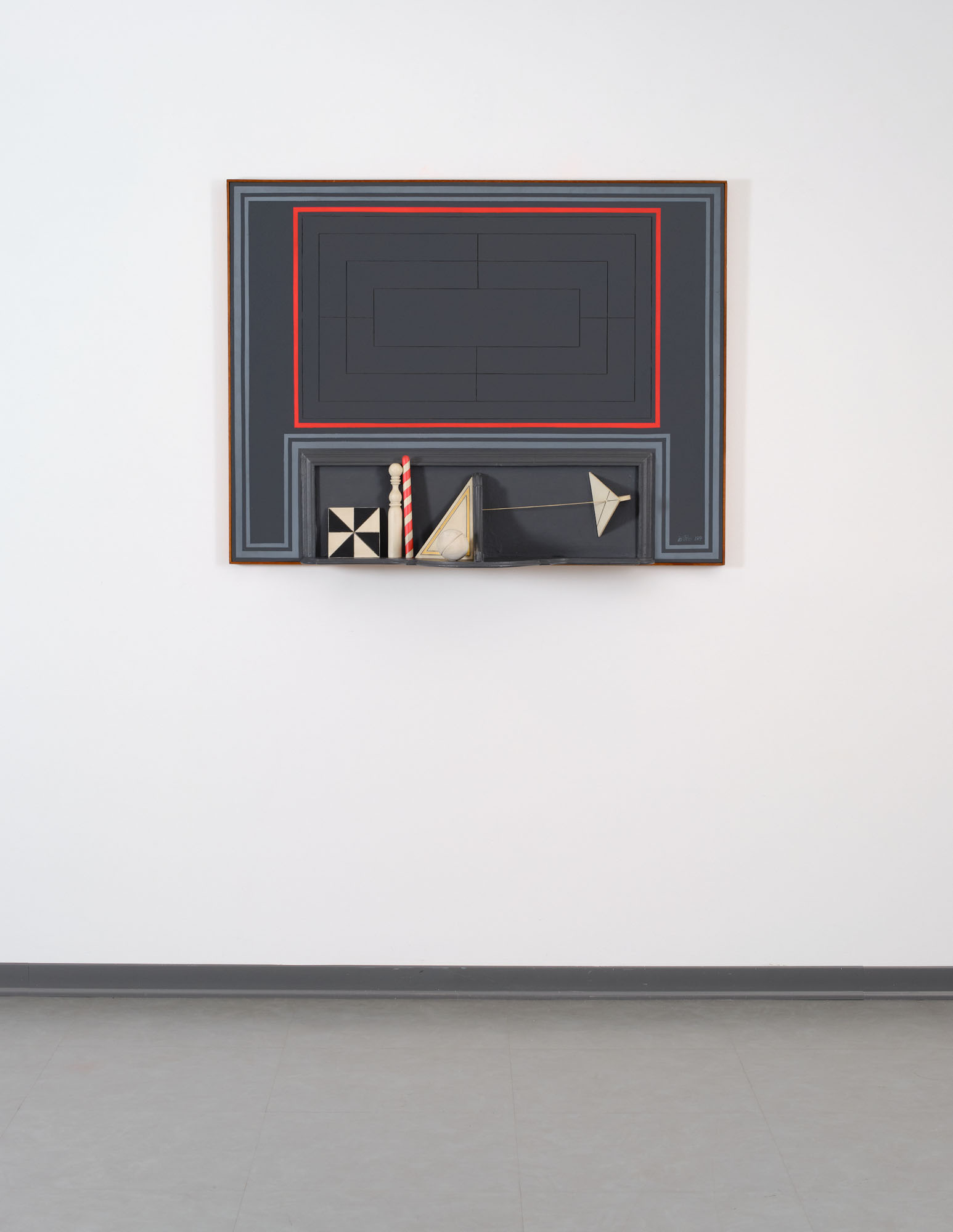 Acrilico e assemblaggio di legni su tavola, cm 89 x 116 x 23
