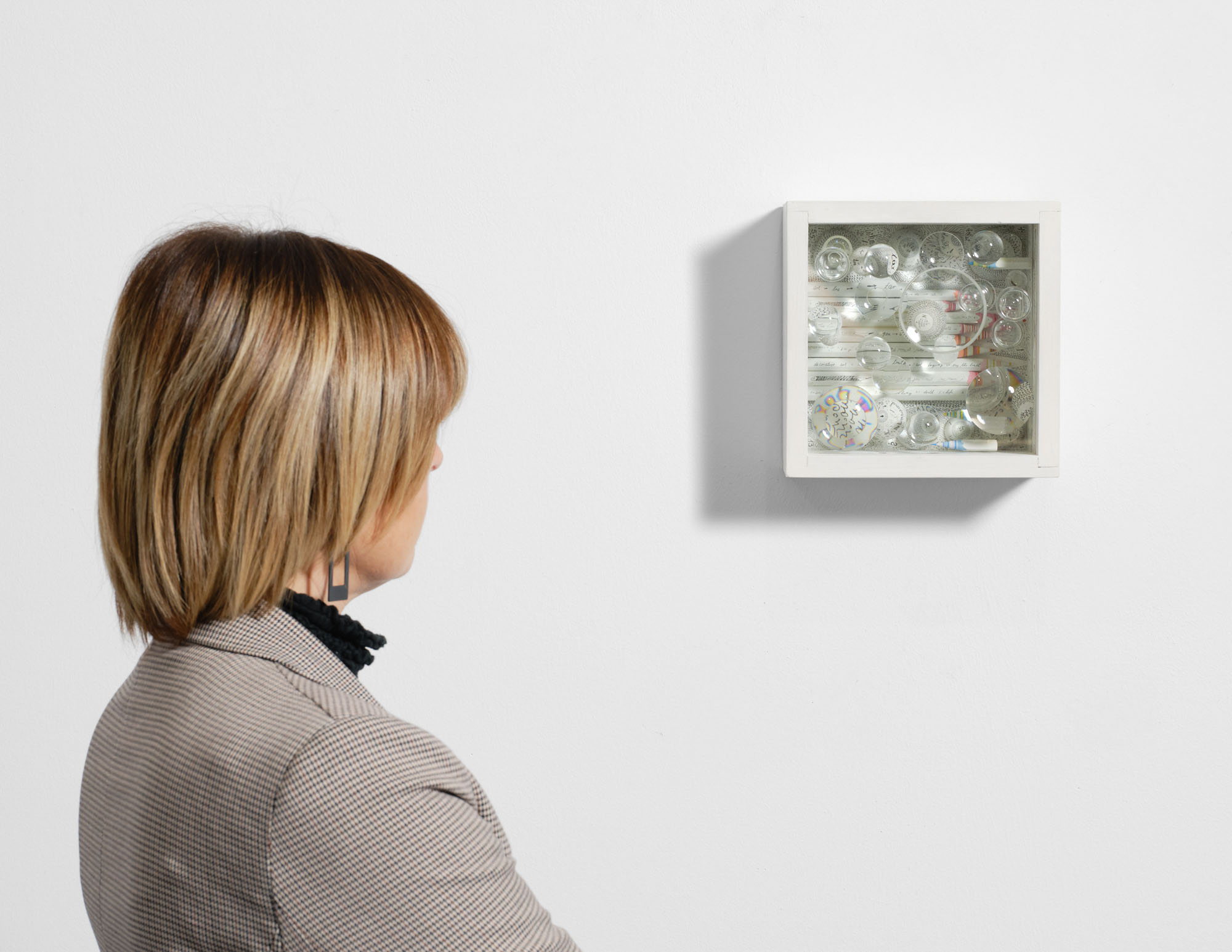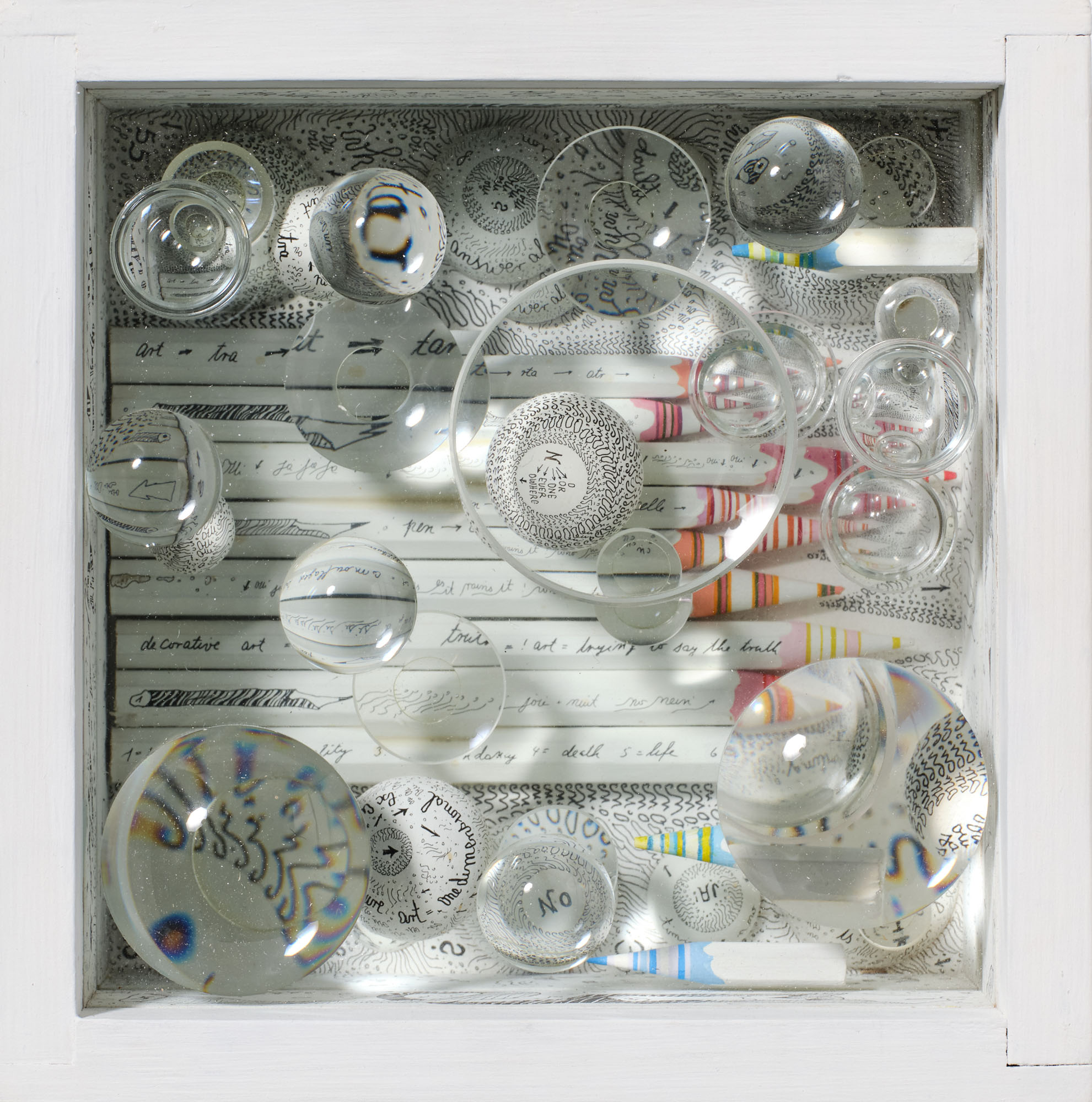 Assemblaggio, legno sagomato e dipinto, vetro, lenti ottiche, inchiostro e pittura, cm 22 x 22 x 10,5