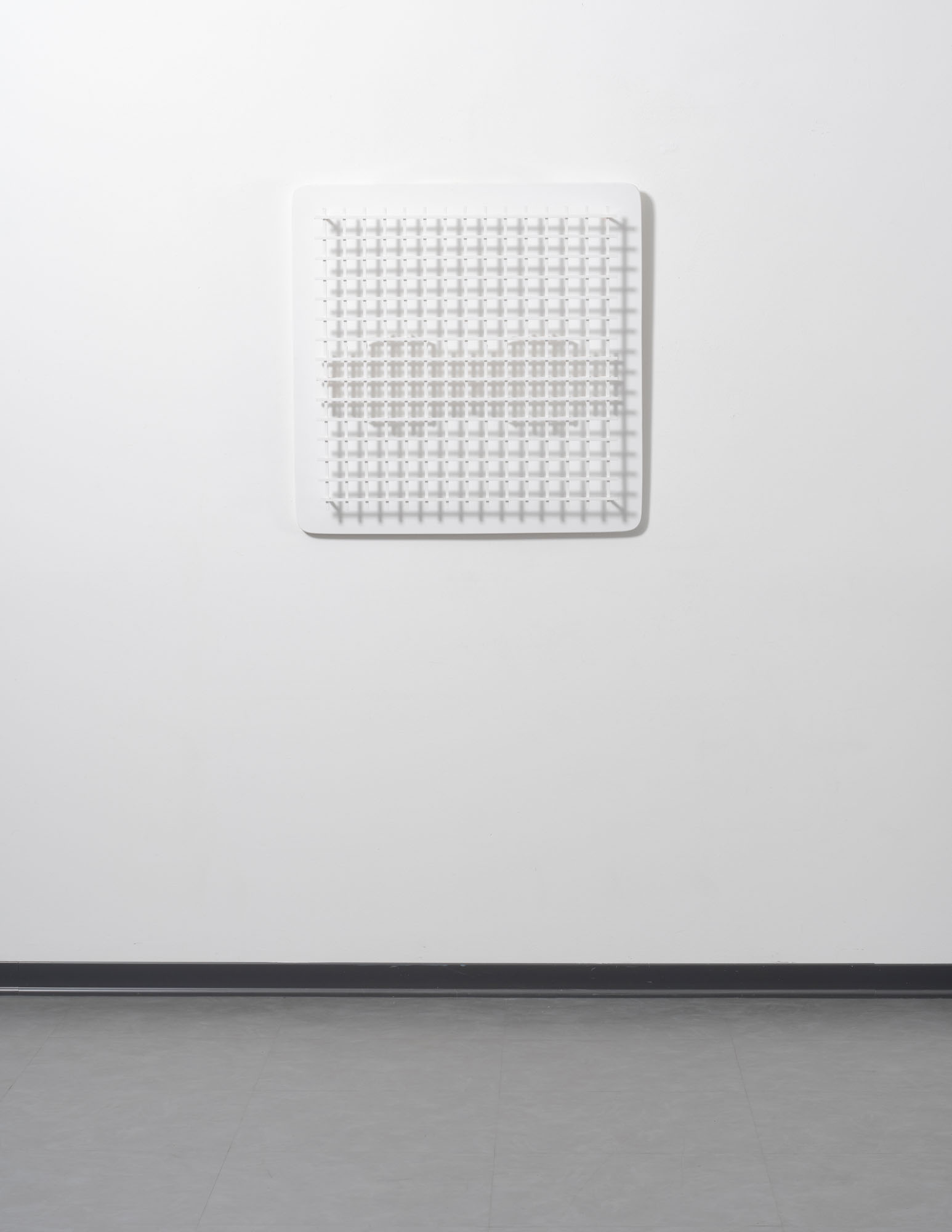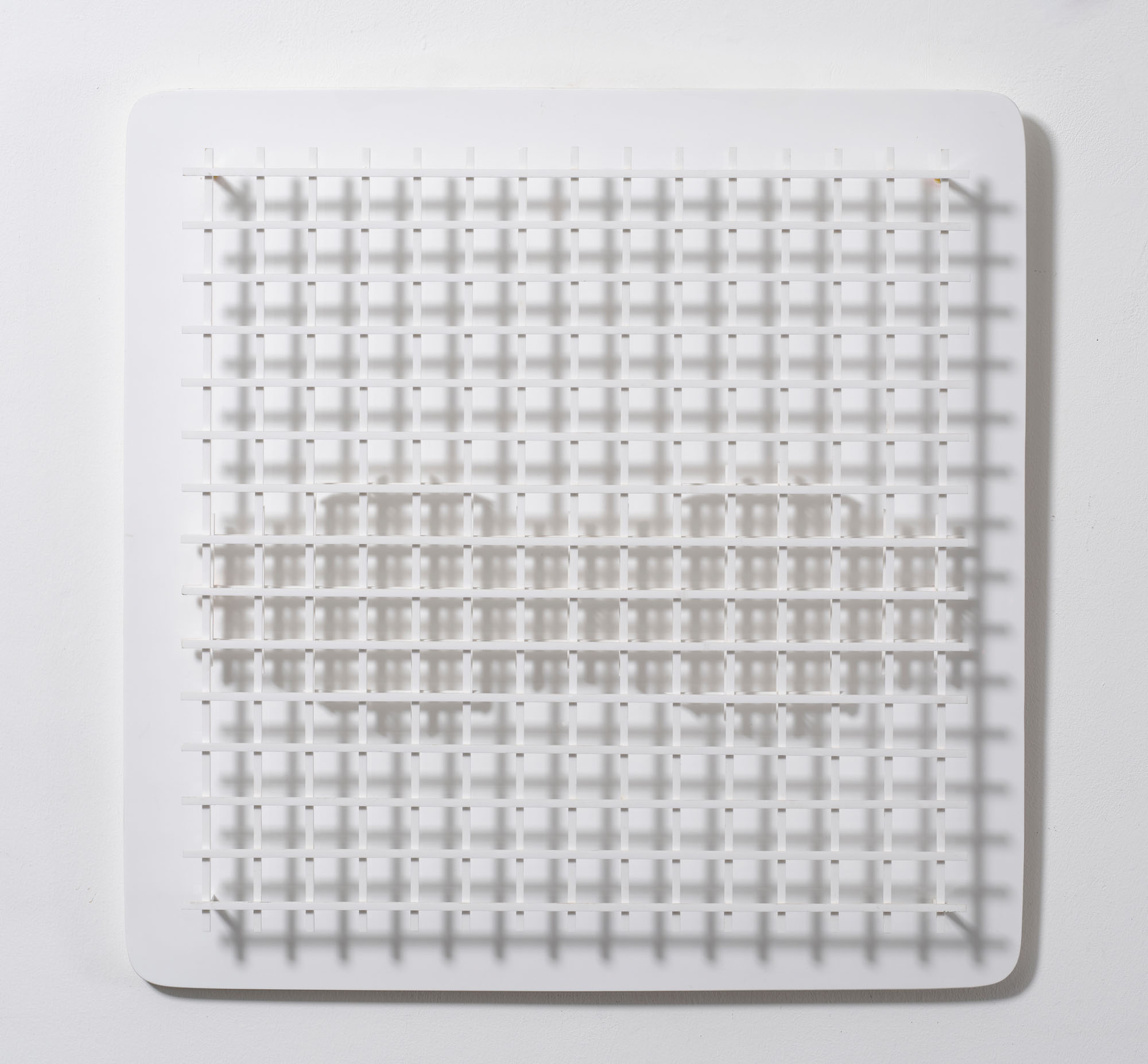 Griglie in plexiglas sovrapposte applicate su tavola, cm 80 x 80 x 5