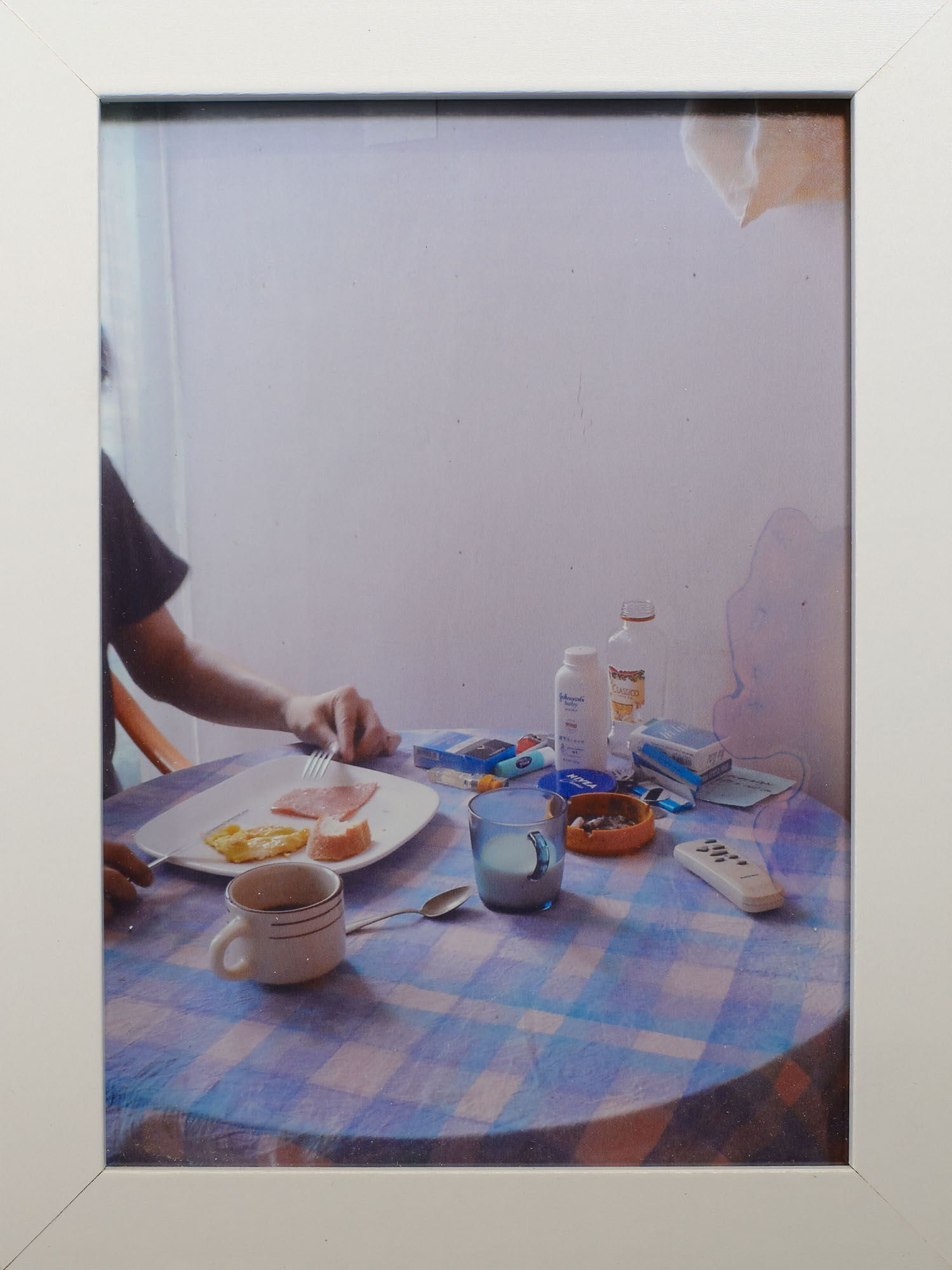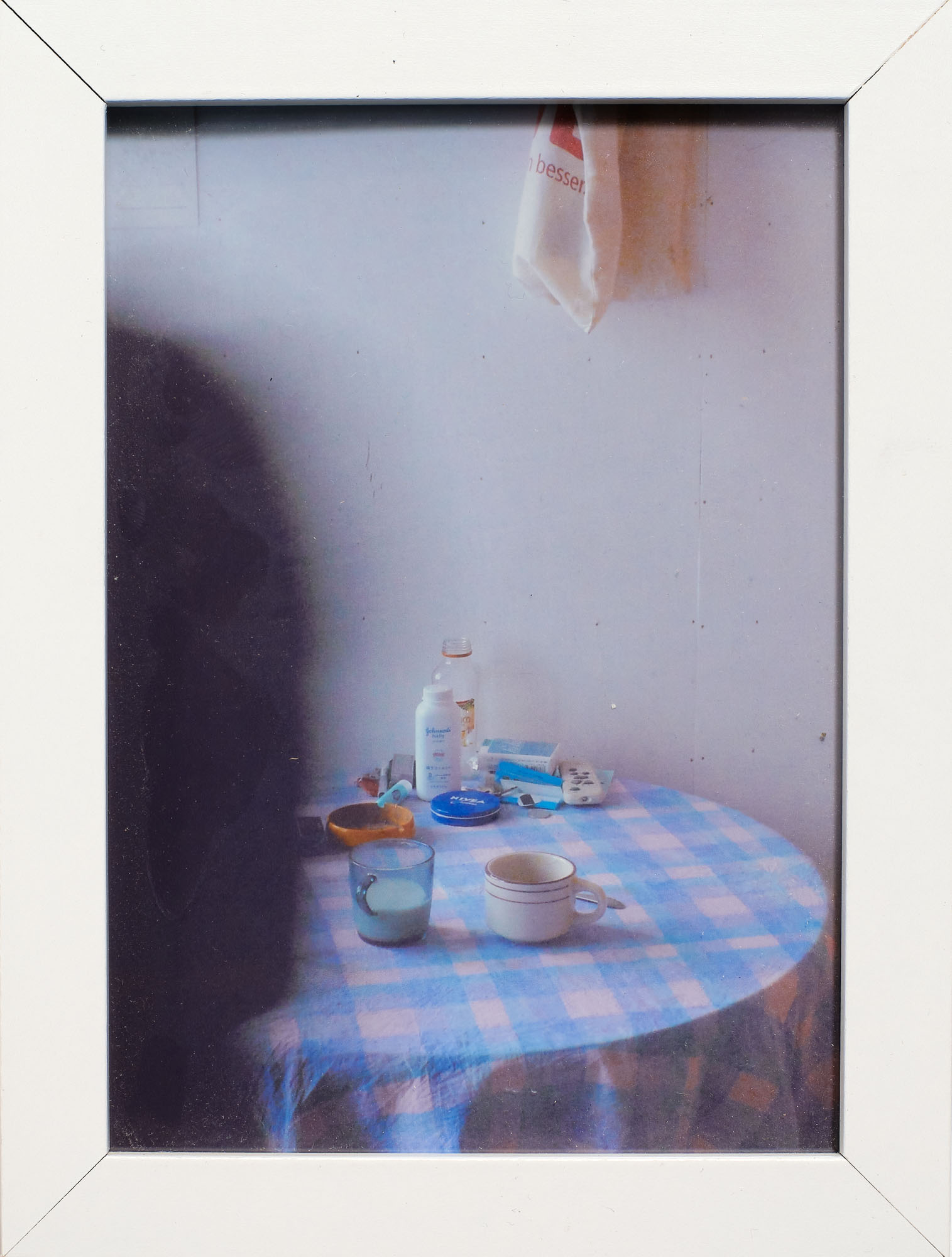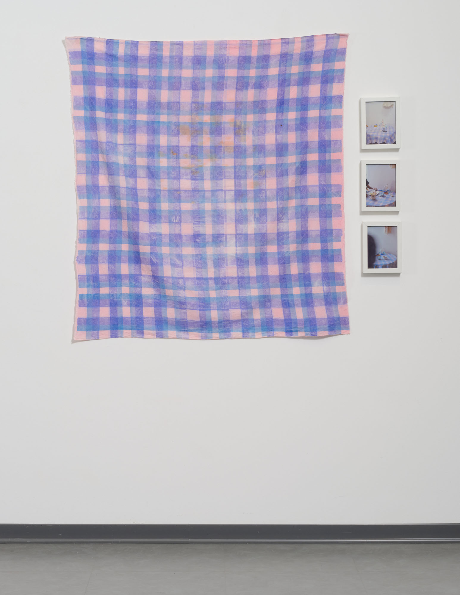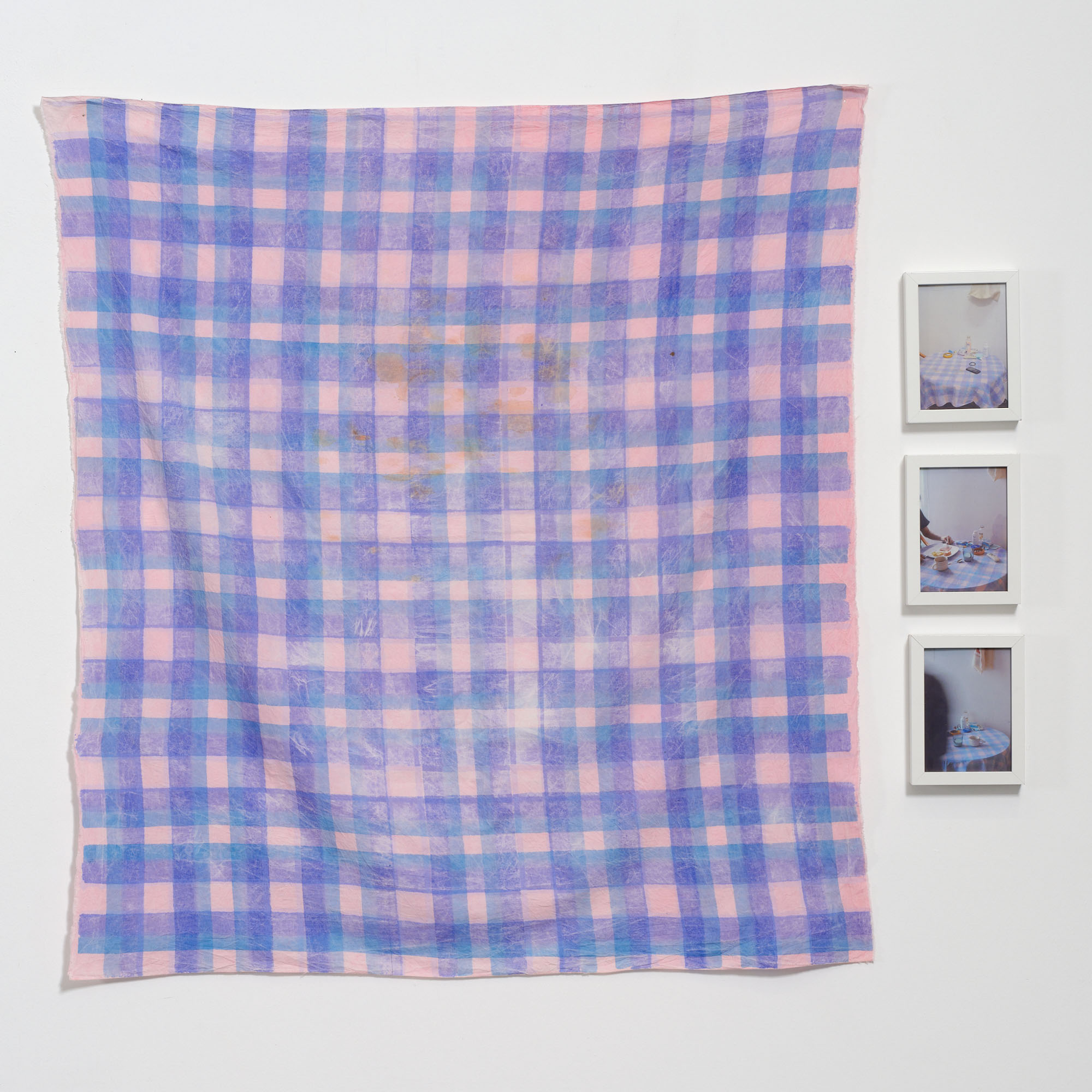 Installazione, tecnica mista su tessuto, 3 fotografie, tessuto cm 121 x 113 - foto cm 18 x 13 cad.