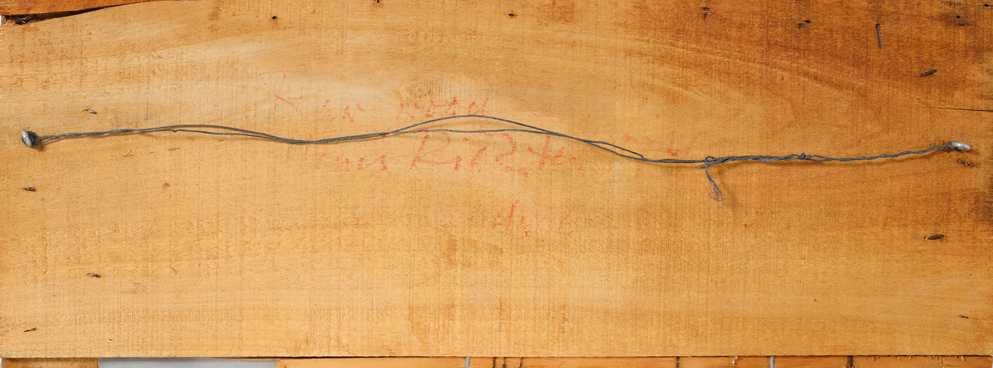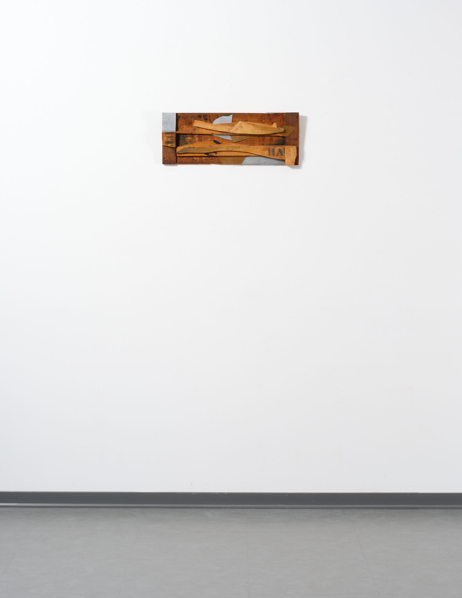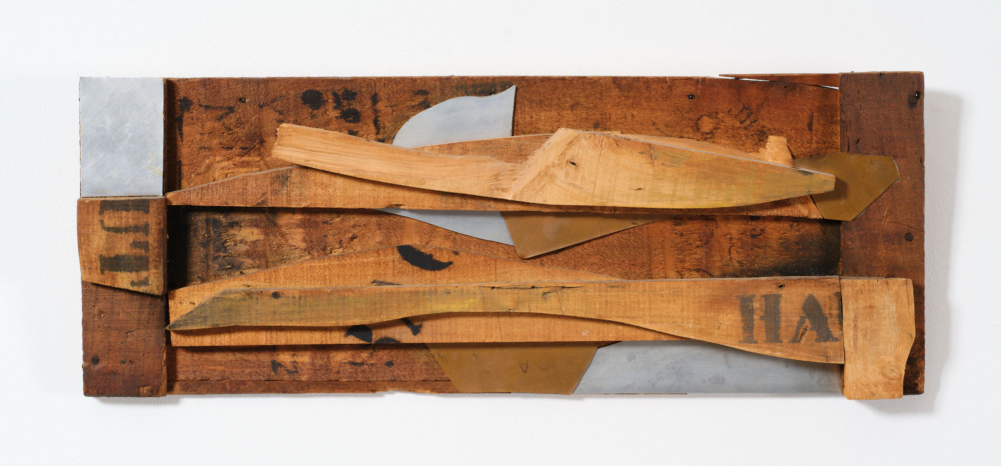 Assemblaggio di legno dipinto e metalli su tavola, cm 26 x 68 x 4,5