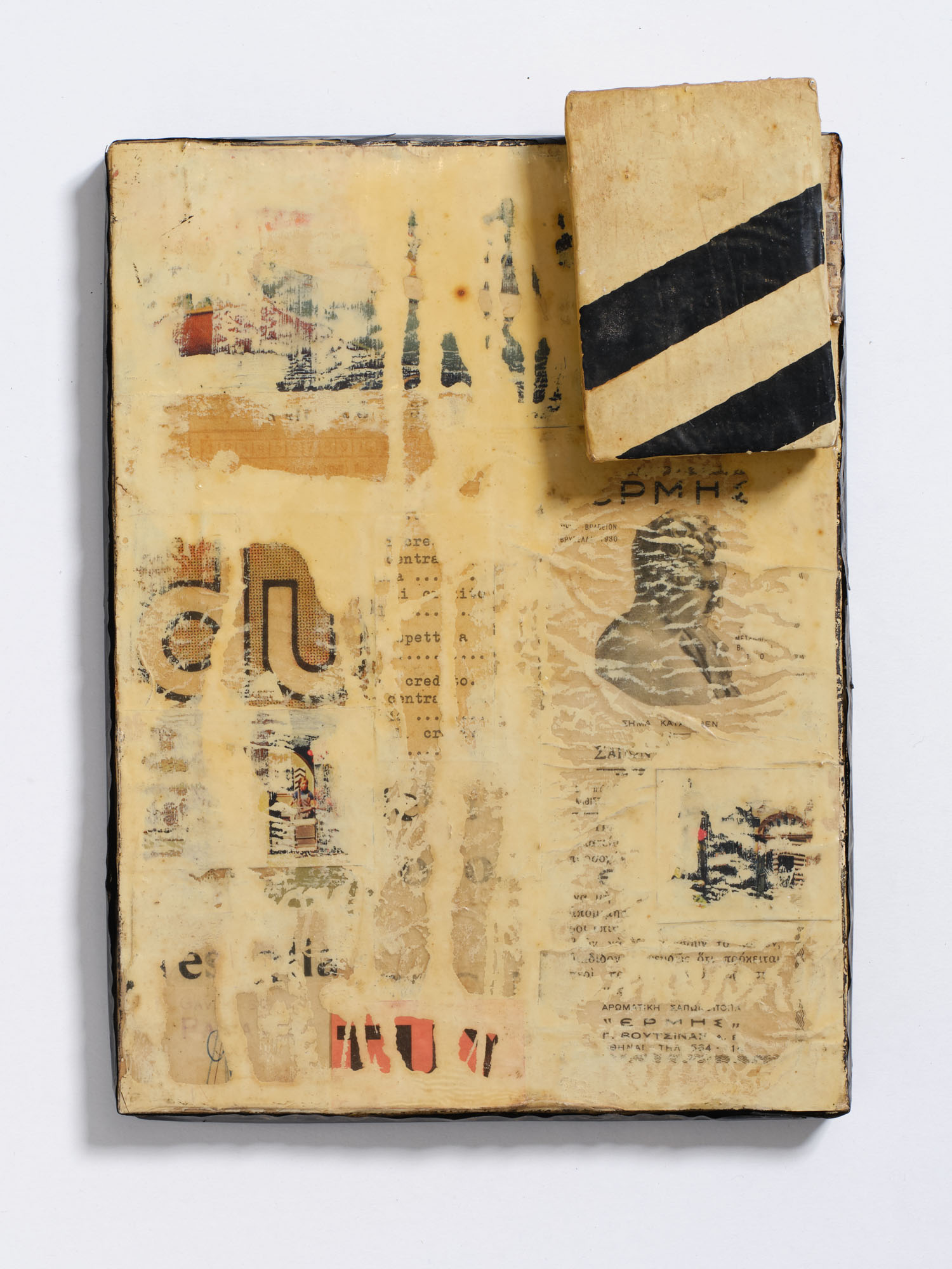 Tecnica mista e collage su tela, inserto in legno, cm 25,5 x 18 x 1,5 (aperta cm 25,5 x 24)