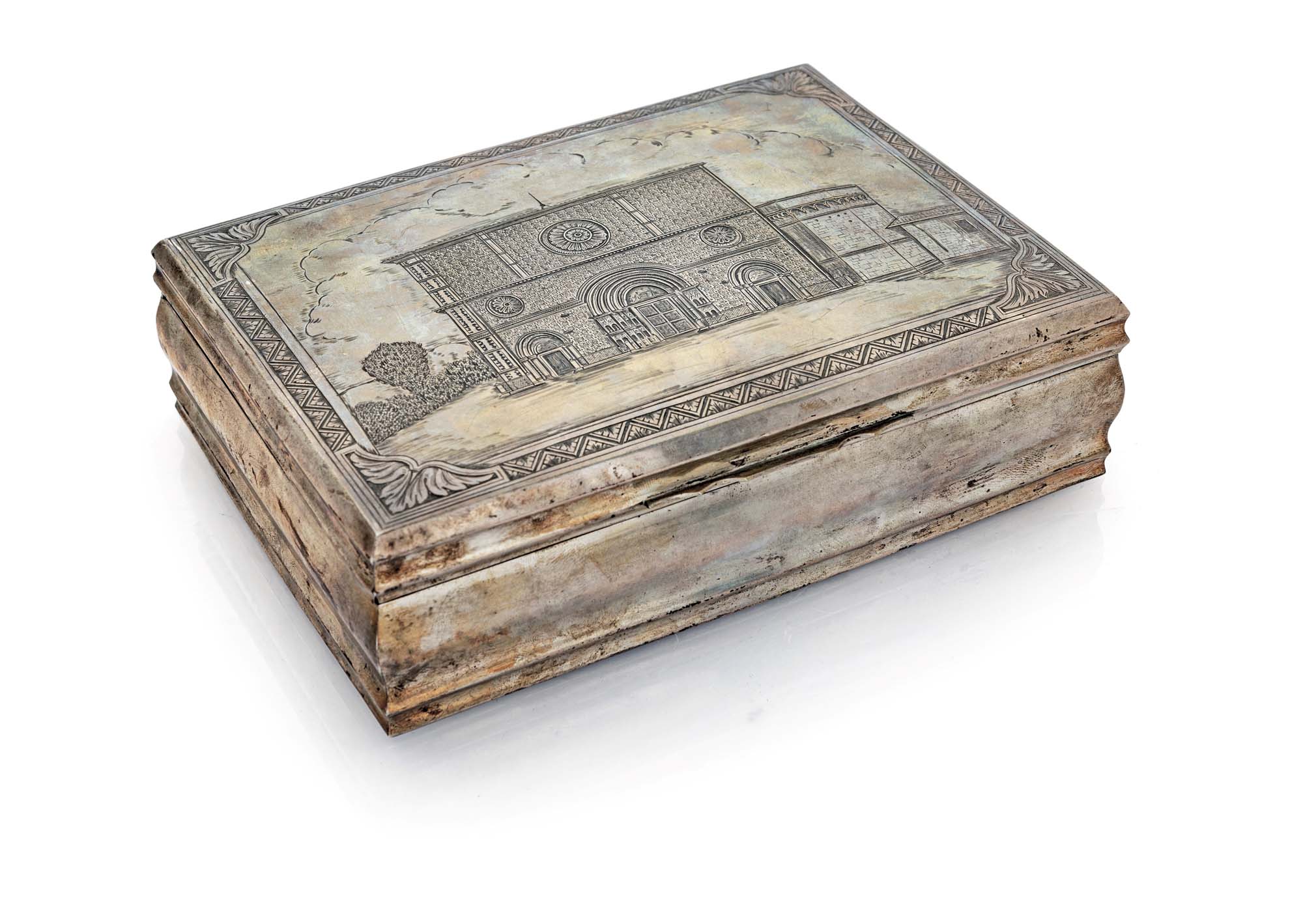 Scatola in legno e lamina d'argento con veduta incisa sul coperchio la...