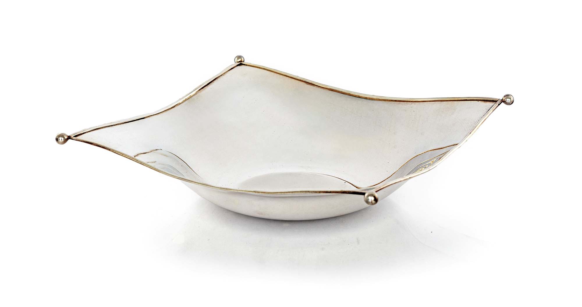 Centrotavola "a fazzoletto" in lastra unica di forma quadrangolare sottolineato da cordolo e rifinito da piccole sfere angolari cm 5,5x23x23 - gr. 326