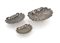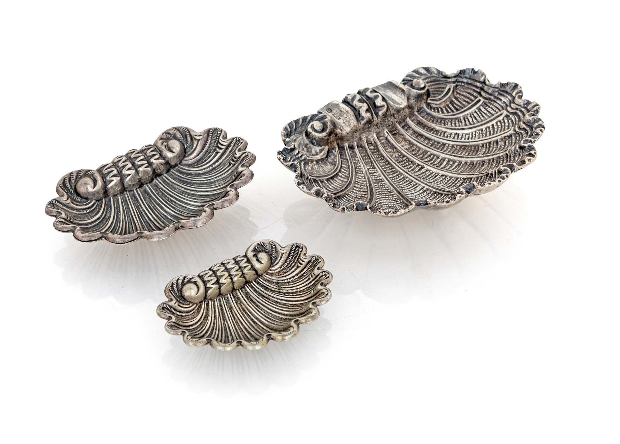Tre conchiglie di misure diverse in argento la più grande, in argento 925/000, reca due incavi posa sigaretta; le due più piccole, di diversa misura, ma con analoghe caratteristiche decorative cm 2,5x12x9,5 - cm 1x9x6,5 e cm 0,7x6,7x5 - peso complessivo gr. 264