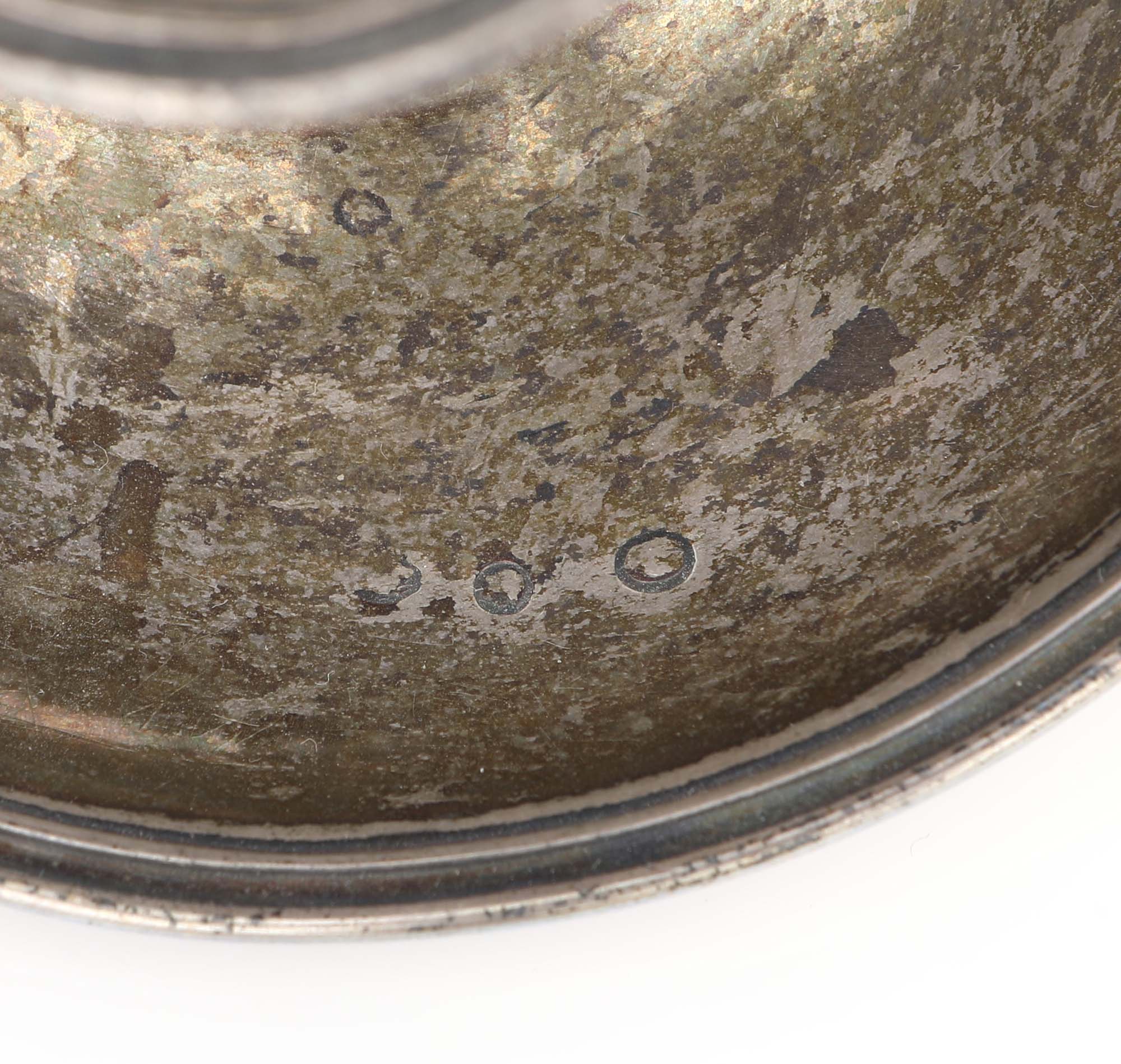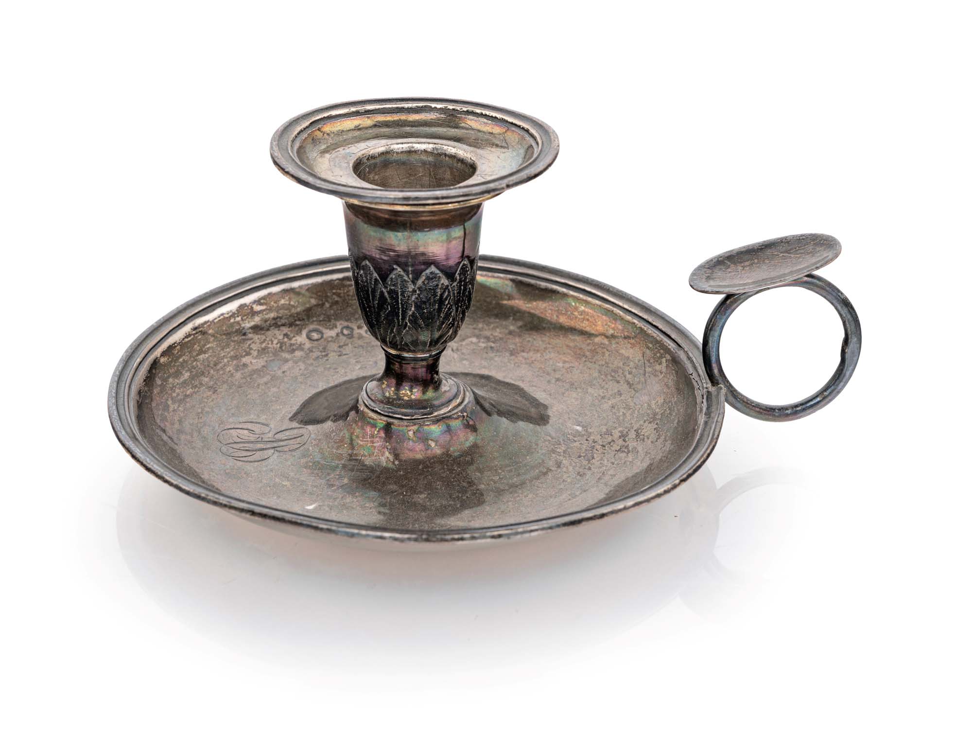Antica bugia in argento portacandela a vaso con foglie lanceolate incise, piattino circolare con iniziali incise e manico ad anello cm 7x15,5x12,5 - gr. 164