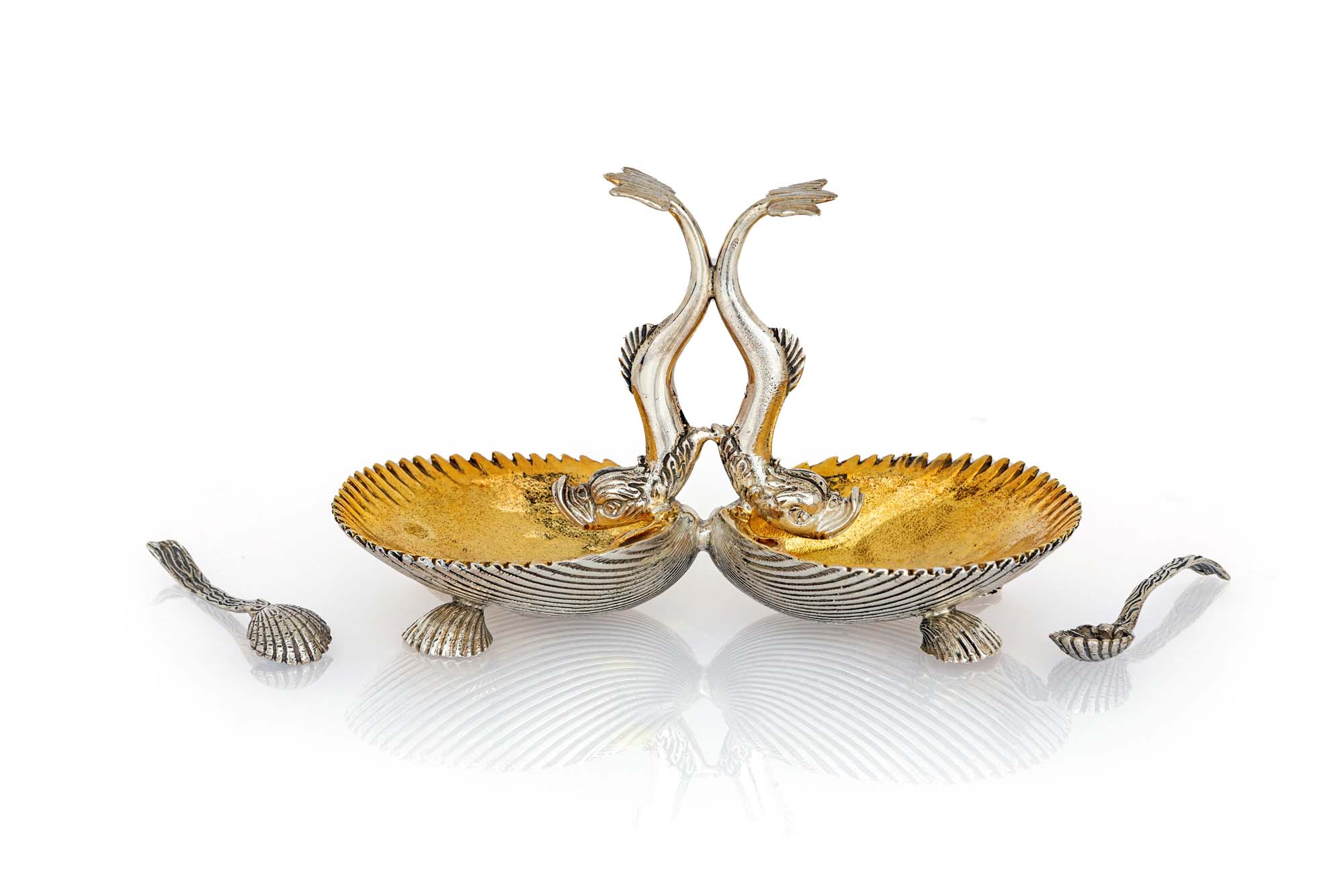 Saliera a doppia valva in argento 925/000 caratterizzata da vaschette in forma di conchiglia internamente dorata e presa centrale costituita da figure di delfino contrapposte; completa di cucchiaini cm 9x15x6 - peso complessivo gr. 264