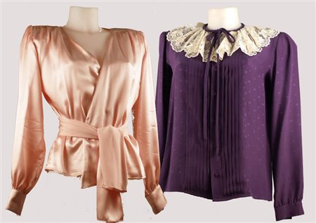 TRE CAMICIETTE IN SETA - THREE SILK BLOUSE Anni Ottanta una viola con colletto in pizzo, Valentino Boutique e due scaldacuore in raso rosa e bianco tg M/L circa